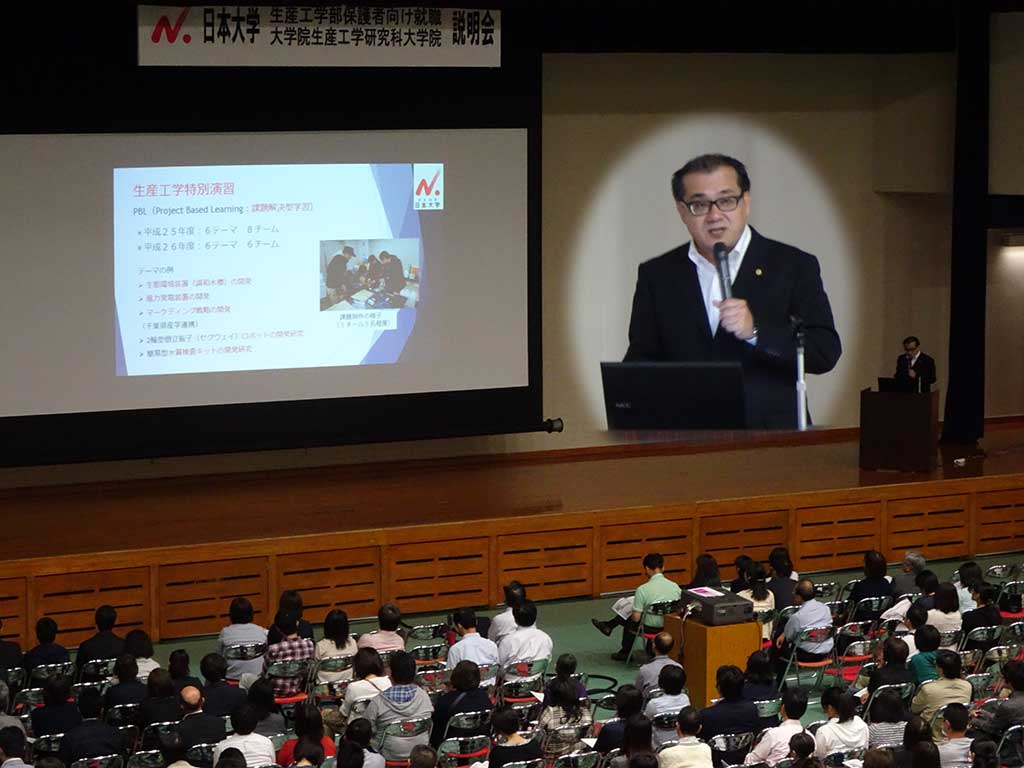 2015年9月26日(土),生産工学部では父母懇談会が行われ,午前中は就職説明会及び大学院進学説明会を行いました.就職説明会及び大学院進学説明会に対するご父母の皆様の関心はとても高く,会場となった体育館を埋め尽くす数の皆様にお越しいただけました.また,大学院進学説明会では数理情報工学科の見坐地先生が大学院の学費及び奨学金等に関する説明を行い,負担面に関するご父母の皆様の疑問を解消することができたのではないかと思います.