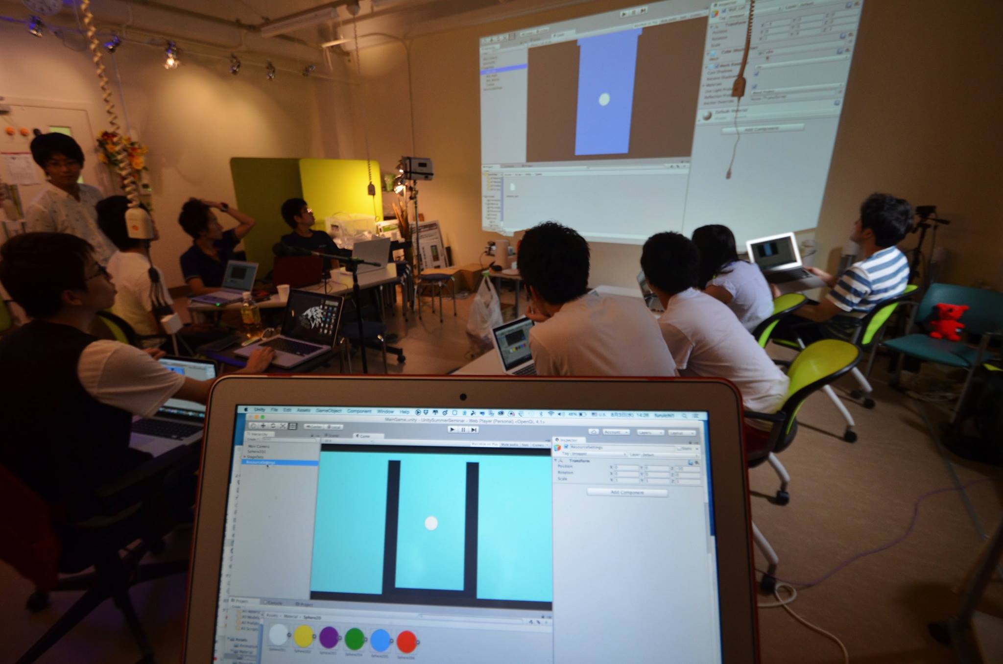 7月末で前期講義が終わって夏休みが始まり,本学科の4年生は卒業研究が佳境に入り,3年生は生産実習(インターンシップ),そして1,2年生は自らの可能性を広める様々な活動にチャレンジをしています.特に,1年生の皆さんは本学に入ってはじめてプログラミングを経験する学生が多く,彼らの多くにとって興味があるのはゲームプログラミングです.授業でゲームプログラミングを学ぶのは3年生ですが,それが待ちきれない学生のために古市研究室が毎年実施しているのが,「ハッカソン~初めてゲームを創る~」です.今年も1年生が沢山あつまり,UNITYを使ってゲームプログラミングを学びました.
