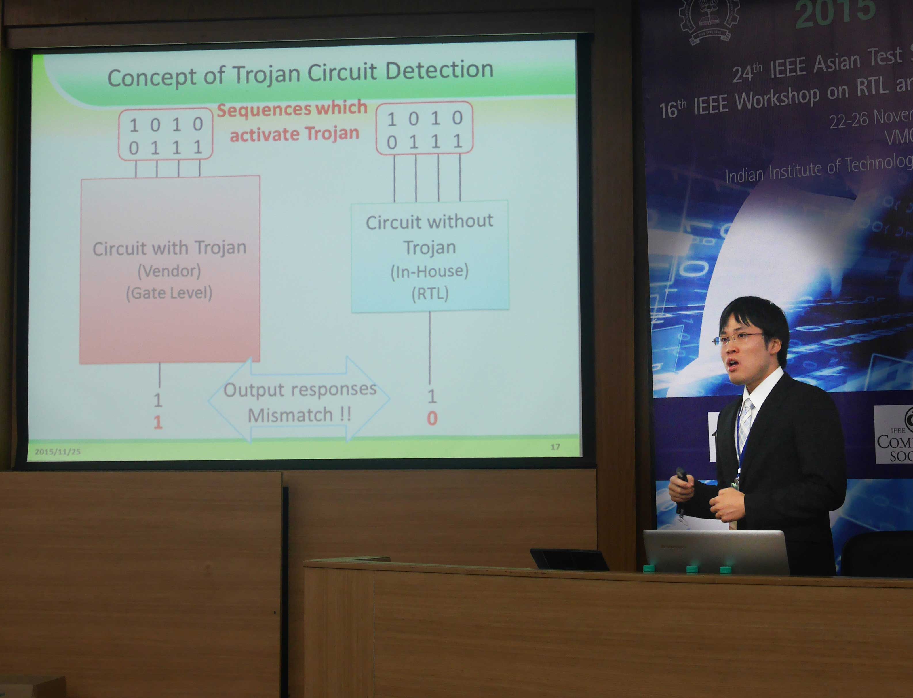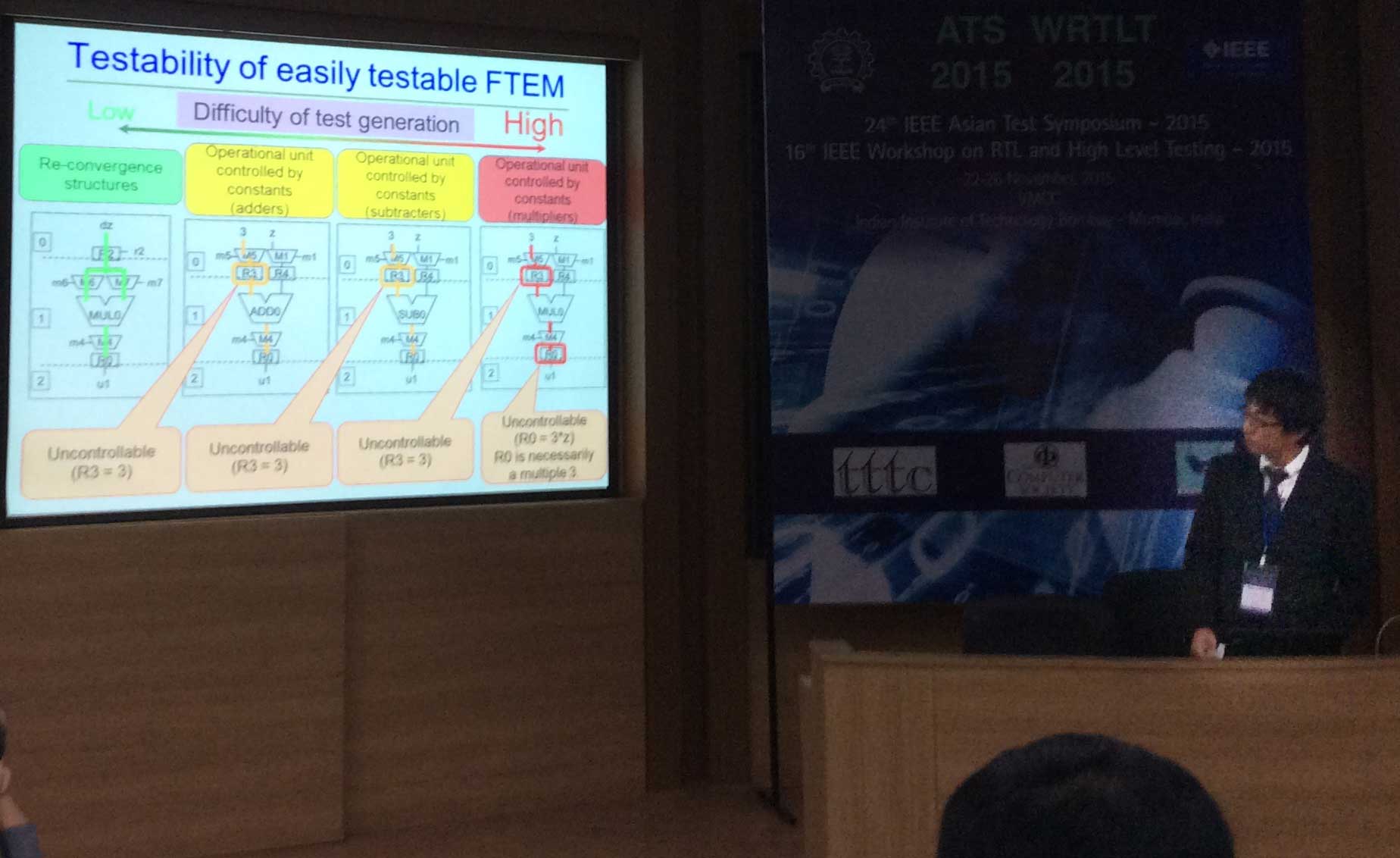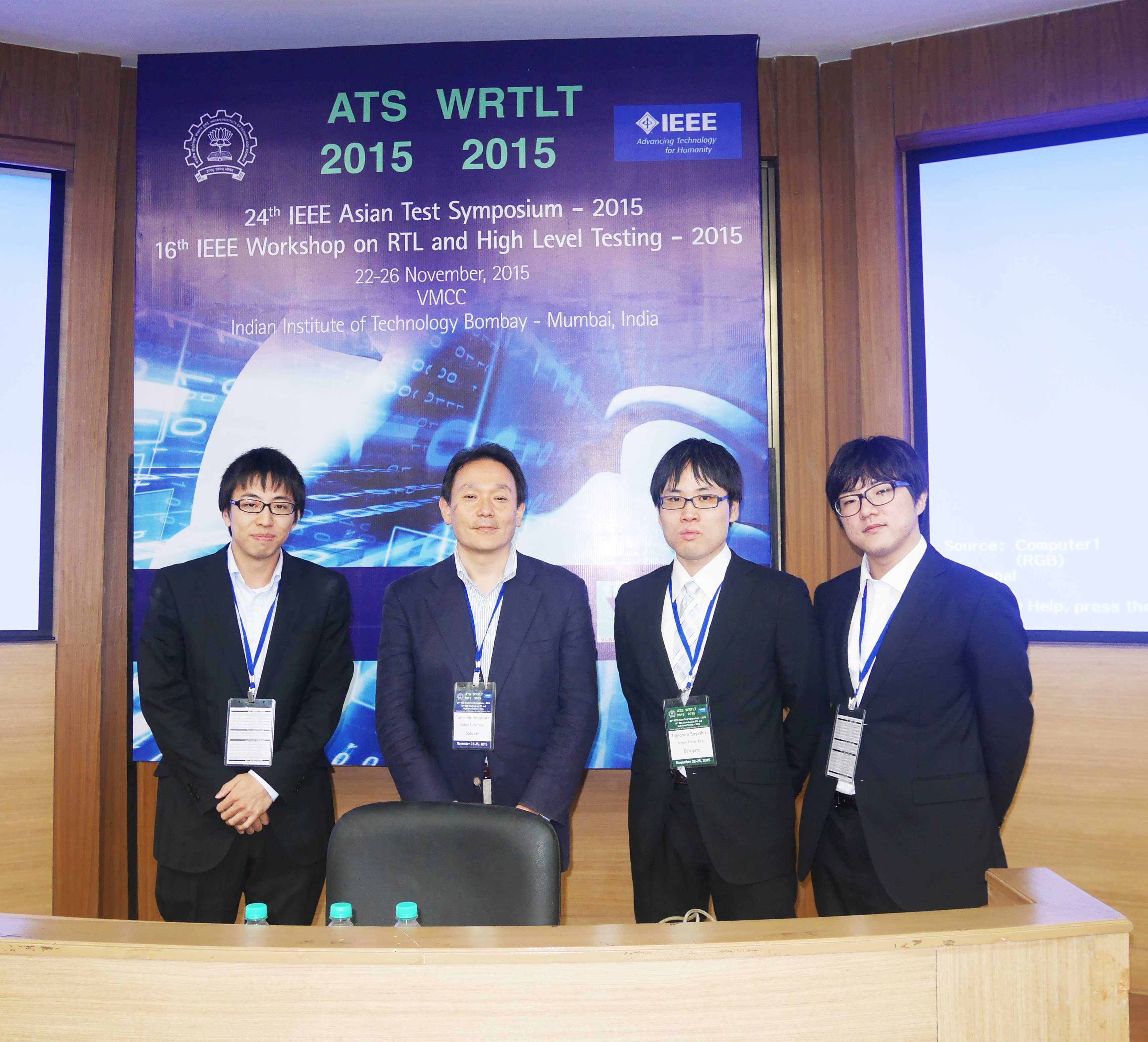 国際会議The 24th IEEE Asian Test Symposium(ATS2015)及びThe 16th IEEE Workshop on RTL and High Level Testing (WRTLT2015)が2015年11月22~26日にインド・ムンバイ・INDIAN INSTITUTE OF TECHNOLOGY BOMBAYで開催され,数理情報工学専攻の大学院博士前期課程2年の増田哲也さん(細川研究室所属)の論文 “A Test Generation Method for Data Paths Using Easily Testable Functional Time Expansion Models and Controller Augmentation”(ATS2015発表),大学院博士前期課程2年の坊屋鋪知拓さん(細川研究室所属)の論文” A Sequence Generation Method to detect Hardware Trojan Circuits “(WRTLT2015発表),大学院博士前期課程2年の高野秀之さん(細川研究室所属)の論文”A Fault Diagnosis Method for a Single Universal Logical Fault Model Using Multi Cycle Capture Test Sets “(WRTLT2015発表)が採択され,発表しました.