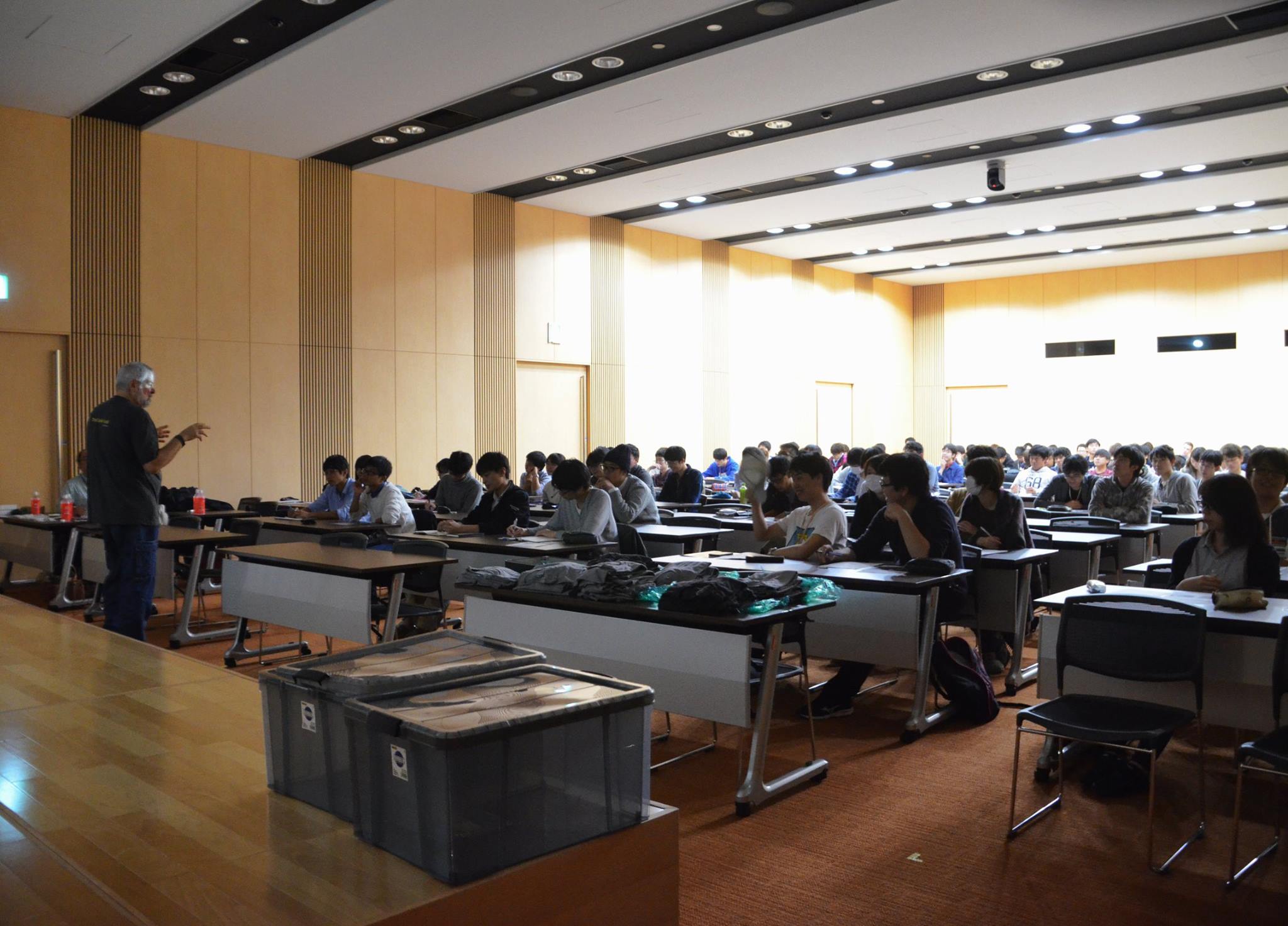 大学院の数理情報工学専攻の講義「メディアデザイン工学特講」では,2012年にアカデミー賞科学技術賞を受賞されたLes Zellan氏を招いて11月14日(月)に特別講義をしていただきました. 会場となったスプリングホールは満員,立ち見も出る程の盛況でした.