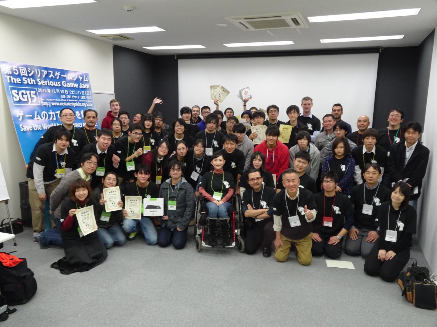 数理情報工学科の古市教授が実行委員長を務めた「第5回シリアスゲームジャム」(主催:日本デジタルゲーム学会教育SIG)が2016年12月10日,11日の2日間,東京・立川で開催され,数理情報工学科から12名(細川研究室,角田研究室,古市研究室所属の3年生及び1年生に加え,2名はオランダのアムステルダム応用科学大学からの留学生2名(岡研究室及び古市研究室所属))が参加し,世界6カ国の学生及び社会人の皆さんと一緒に5本のシリアスゲームを2日間で開発しました.今回のテーマは「みんなのバリアフリー」,バリアフリーに対する関心を高めることを目的としたシリアスゲームを開発しました.数理情報工学科の12名は3つのチームに分かれて開発を行い,3チーム総てが以下の各賞を受賞しました!