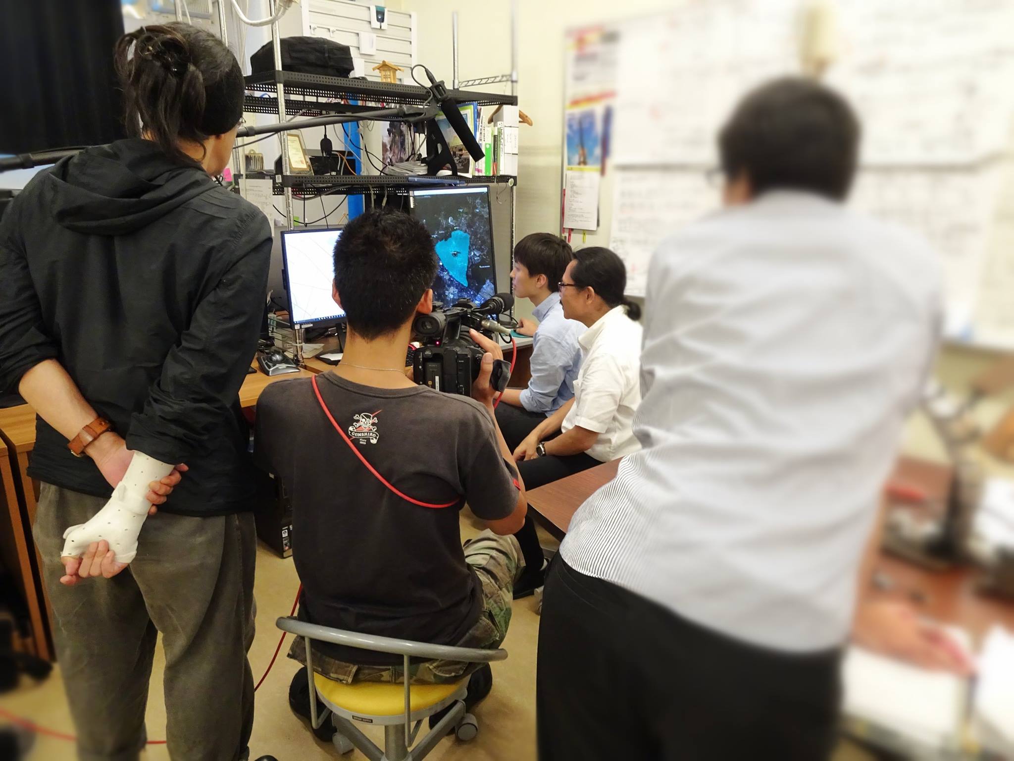 7月28日(金)に研究室で行われた収録時,FITSを操作する高橋君とパラメタの指示をする古市教授