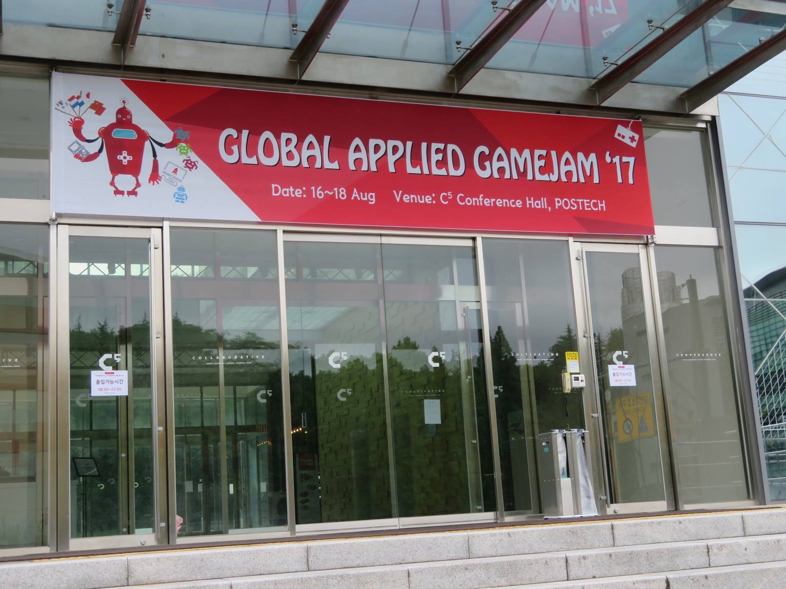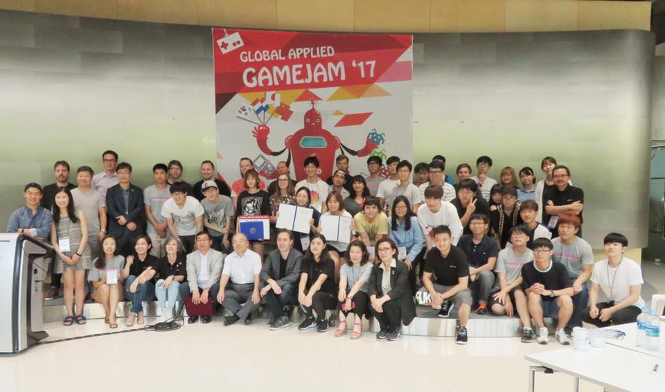2017年8月16日~18日に韓国で開催された国際ゲームジャムGAGJ17(Global Applied Game Jam)にメディアデザインコース4年生の高橋昂大君が参加し,オランダ,中国,韓国の学生とチーム Hot Chilliを組み,プログラマとして活躍しました.Applied Gameとはシリアスゲームのオランダにおける呼び名で,韓国ではシリアスゲーム,アプライドゲーム,あるいは機能性ゲーム等の名前で呼ばれています.GAGJ17にはオランダ人のユトレヒト芸術大学の学生が8名,中国の吉林動画学院の学生が6名,日本からは日本大学の学生が1名参加した他,韓国からはPOSTEC,ソウル国立大,SUNY等の各大学から30名が参加し,3日間で8つのシリアスゲームを開発しました.