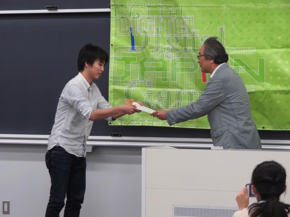 大学院1年の鈴木雄次郎君が発表したタイトルは「協調性の向上を目的としたシリアスゲーム Line H!tterの開発と評価」で,インタラクティブ(デモンストレーションとポスター)セッション及びオーラルセッション(口頭発表)の双方で2件発表,学生奨励賞を受賞しました.おめでとうございます!