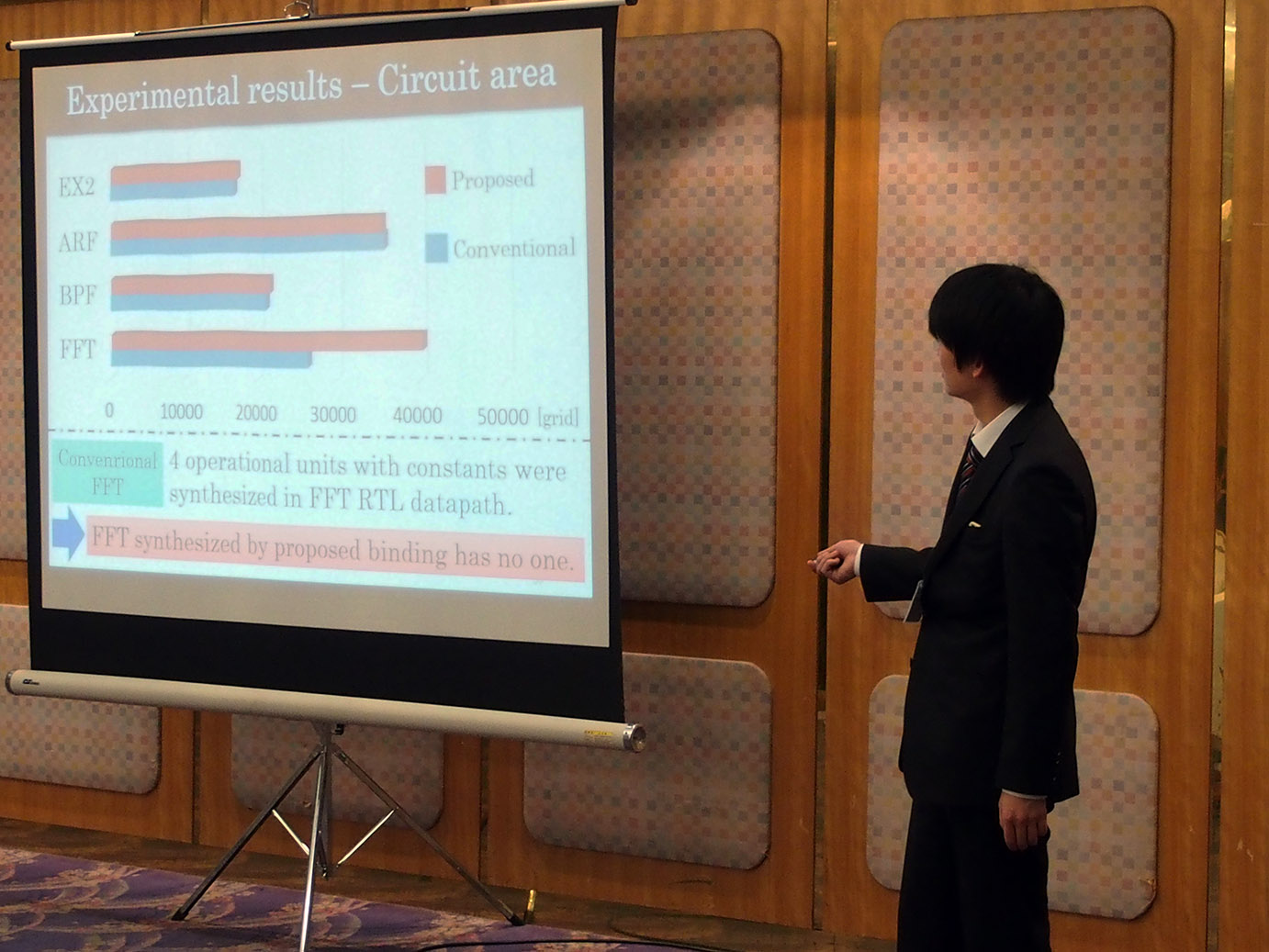 佐藤さんの発表内容は,デジタル情報機器に搭載されているシステムLSI(大規模集積回路)の動作記述(C言語など)からテスト容易なレジスタ転送レベル回路(Verilog-HDLなど)を合成するアルゴリズムに関するものです.システムLSIは製造後にその品質を保証するためにテストを行う必要があります.ハードウェアの各要素は外部入力や外部出力に近いほうが,その際に使用する0と1の値で構成されるテストパターンの系列を容易に生成することができます.合成時にハードウェアの演算器の入力は外部入力から近い経路を、演算器の出力は外部出力に近い経路を生成するアルゴリズムを提案しました.実験では,このテスト容易化動作合成アルゴリズムを適用して生成された回路に存在する演算器の入出力はすべて外部入力と外部出力へレジスタ1個のみ介して到達できる経路を生成できたことを示しました.