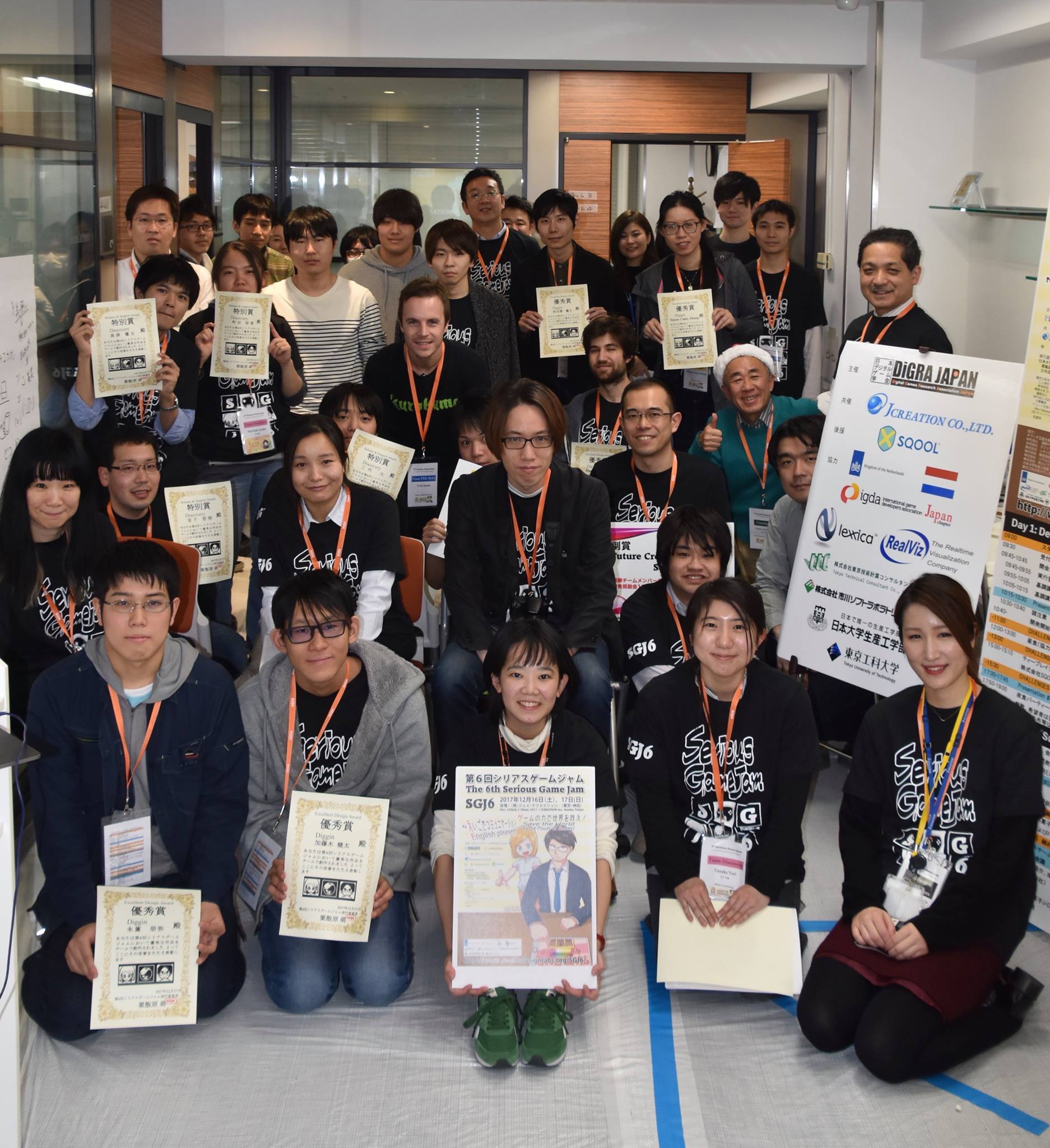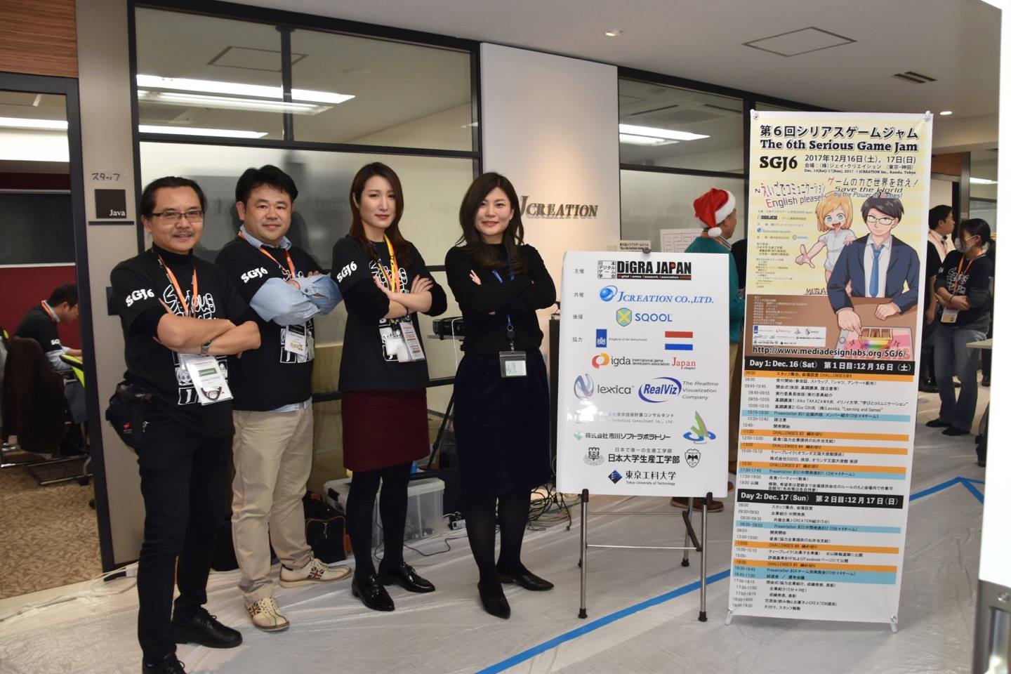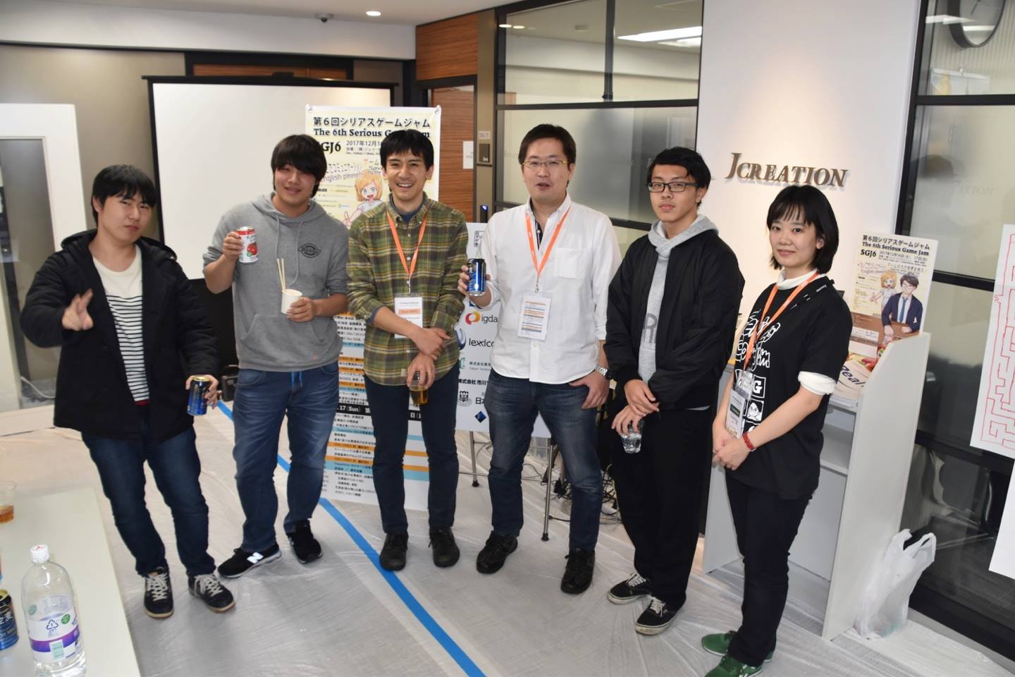 2017年12月16日(土)と17日(日),日本デジタルゲーム学会・ゲーム教育研究部会主催による「第6回シリアスゲームジャム(SGJ6)」が東京・神田で開催され,日本・イギリス・オランダからの学生及び社会人の皆さんが集まり,2日間でシリアスゲームをジャム形式で制作するイベントが行われました.数理情報工学科からは情報工学コース及びメディアデザインコースの4年生が3名,大学院生が1名,オランダからの留学生1名が3つのチームに分かれて参加し,最優秀賞及び優秀賞を受賞しました!