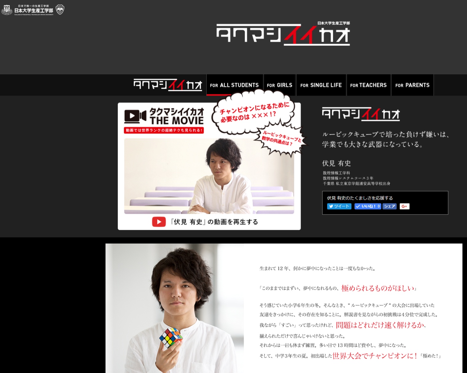 生産工学部HPの人気コンテンツ「タクマシイイカオ」に3年生の伏見有史君のコンテンツが追加されました.