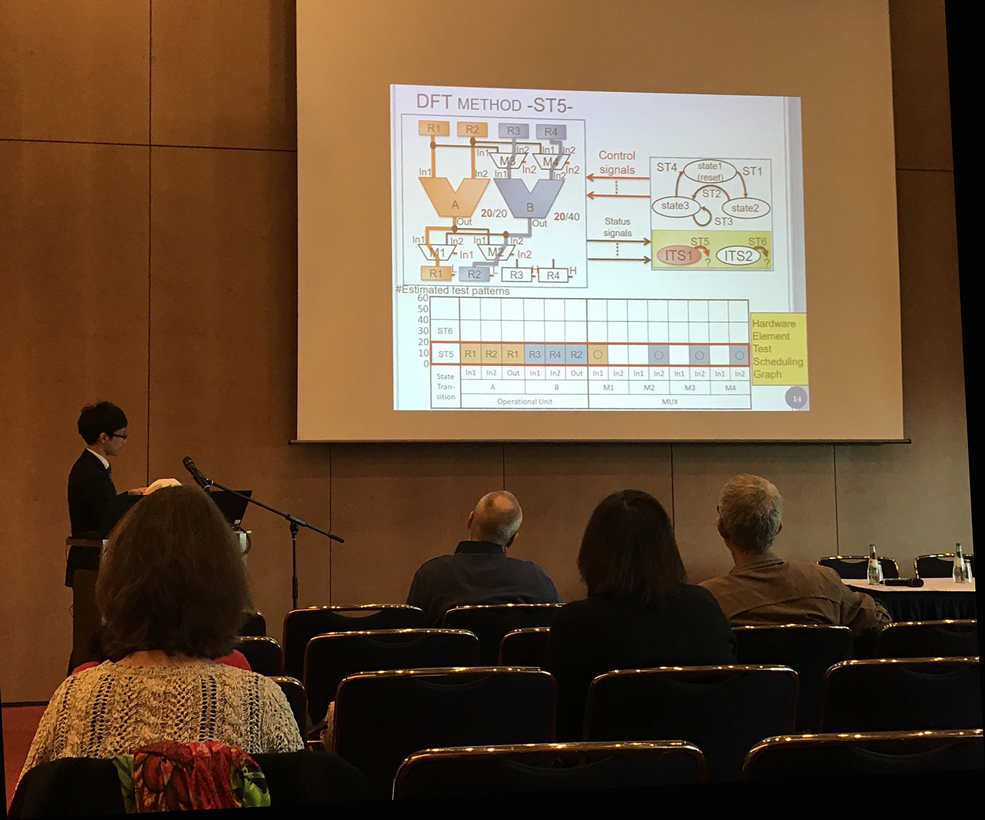 武田さんの発表内容は,システムLSIのレジスタ転送レベルのテスト容易化設計に関するものです.システムLSIの製造後のテストでは,低コストで高品質なテストパターンが要求されます.データパス回路中のハードウェア要素である演算器とマルチプレクサを可能な限り同時にテストできるテストレジスタ割当てアルゴリズムと,そのテストレジスタ割当てを実現するためのテスト容易化設計手法を提案しました.具体的にはコントローラと呼ばれる有限状態遷移機械の拡大を行い,テストパターン数を武田さんが以前国際会議で発表された従来技術(WRTLT’16,IOLTS’17)と比較して平均10%削減できることを示しました.