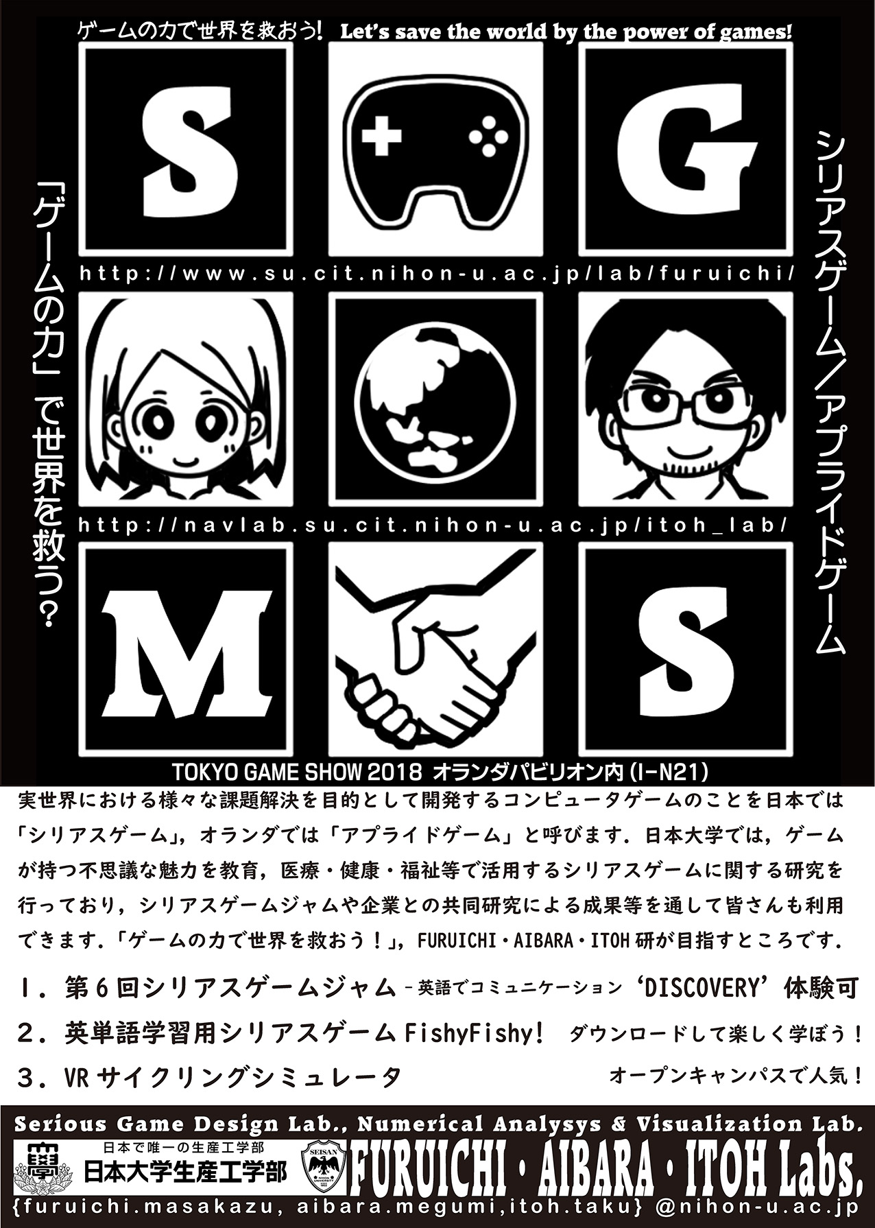 数理情報工学科は,今年も東京ゲームショウ2018(2018年9月20~23日に幕張メッセで開催)に出展します! 今年は古市研究室に加えて伊東研究室と粟飯原助手も参戦し,昨年12月に実施した第6回シリアスゲームジャムの成果であるDiscoverly(その場で体験)の他,シリアスゲームに関する研究成果を初めてiOSにリリースしたFishyFishy!(ダウンロード),そして VRサイクリングシミュレータ(ビデオ)を出展します.場所はオランダパビリオン内(I-N21),入場口からとても近いエリアです.出展者一覧の中には「オランダパビリオン オランダ王国大使館」と記載されています.