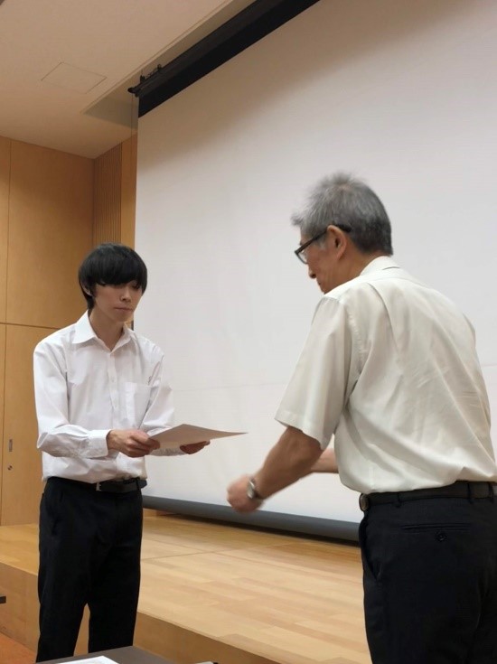 数理情報工学専攻博士前期課程1年の榎本知幸君(角田研究室)が,8月27日(月)に本学部津田沼キャンパスで開催された第37回数理科学講演会(主催:数理科学会)において学生奨励賞を受賞しました.
