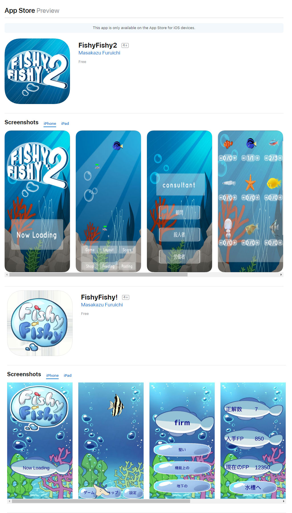 (サイトから引用した説明文) FishyFishy2及び FishyFishy!は,英語の語彙能力向上を目的として日本大学生産工学部古市研究室所属のFishyFishy開発チーム(リーダ:久保田大輝,メンバ:Naomi Nazar,齋藤咲子,Daniel de Luca,坂口穣,大井朋子,粟飯原萌,古市昌一)が設計・開発したシリアスゲームです.使用している英語教材は(株)Lexxicaが提供するWordEngineを利用し,学習者の英語レベルに合わせたコンテンツが自動的に利用されます.従って,語彙はネイティブスピーカ自らも学習できる難易度まで備えているため,どれだけ長期間学習しても学習用コンテンツがなくなることはほぼありません.さぁ,皆さんも英語を学んでFP(Fish Point, 学習することによって得られるゲーム中で魚や餌を購入するために使えるポイント)を獲得してみませんか?知らぬうちにTOEICの得点がアップしていることに皆さんはビックリすることでしょう.