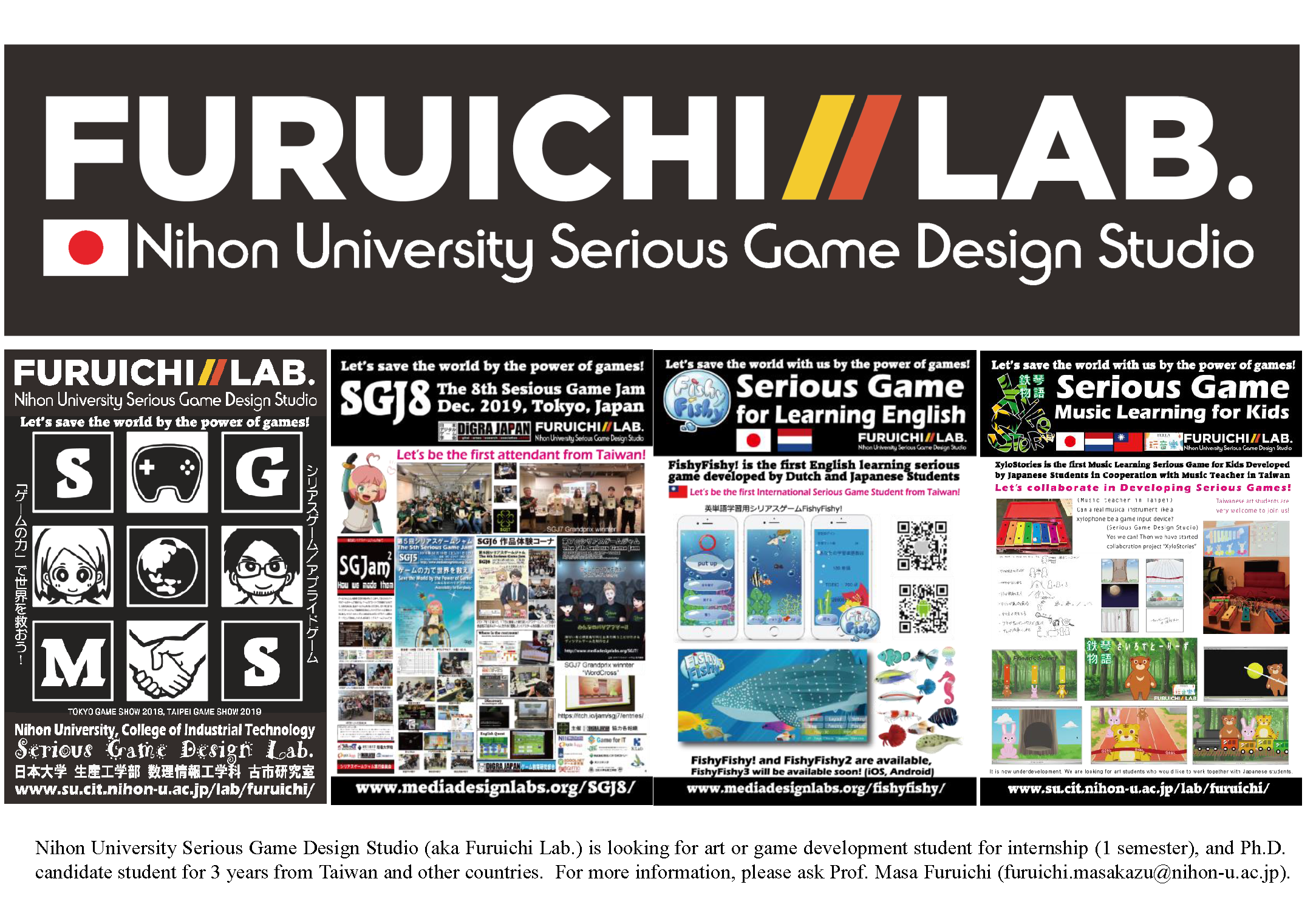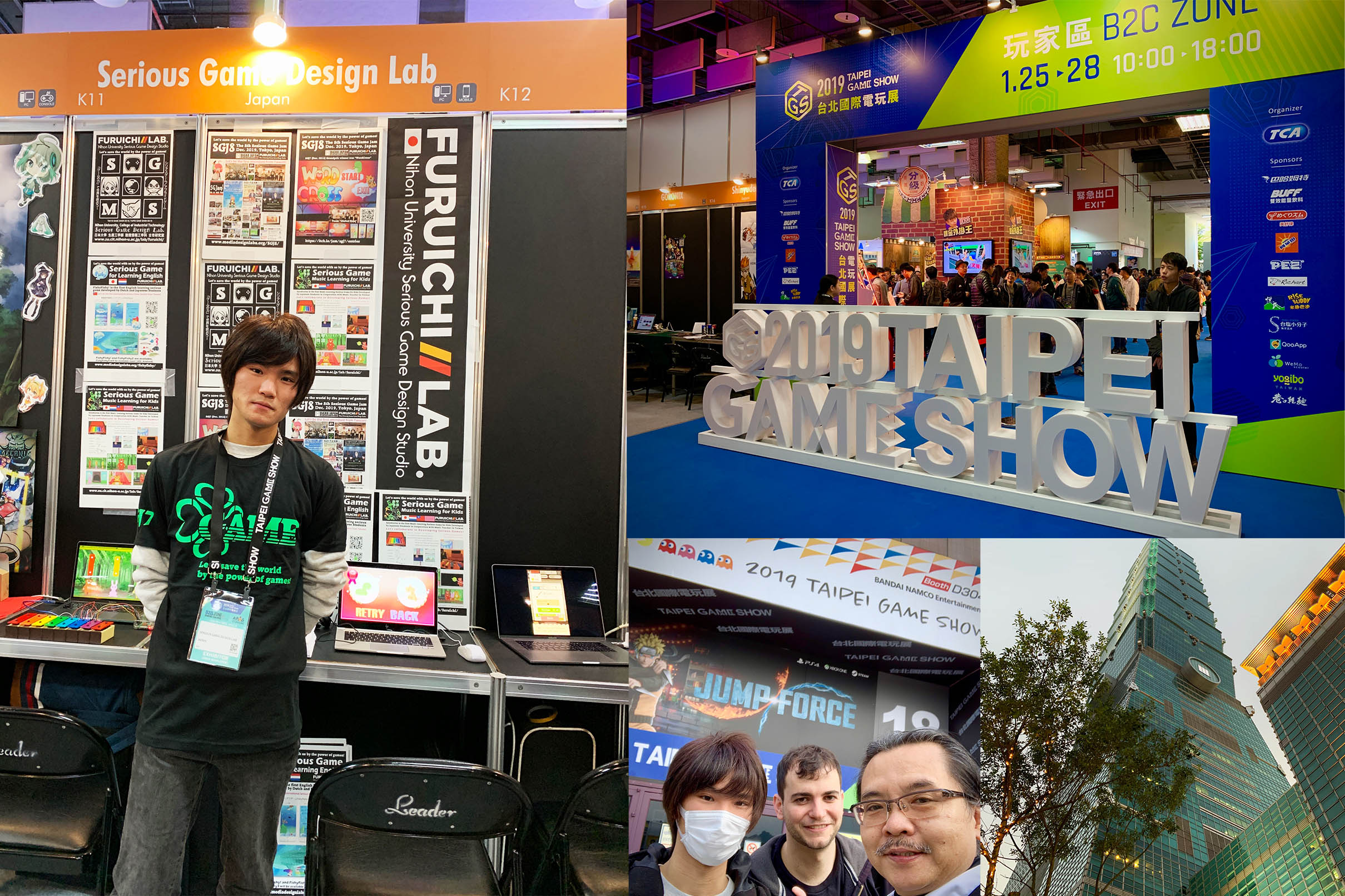 2019年1月24日~25日に 台北ゲームショウが台湾・台北で開催され,4年生の齋藤憧弥君が卒業研究の一環として台北の音楽教師と共同開発中の XyloStoriesを出展してきました.加えて,大学院生と4年生がオランダからの留学生と共同で開発した英語学習用知育ゲームの FishyFishy!,そして第7回シリアスゲームジャムの最優秀作品Word Crossing等を「日本大学シリアスゲームデザインスタジオ」として出展しました.東京ゲームショウよりも来場者数が多い台北ゲームショウ,日本大学のシリアスゲームは,今後もどんどん海外に進出します.