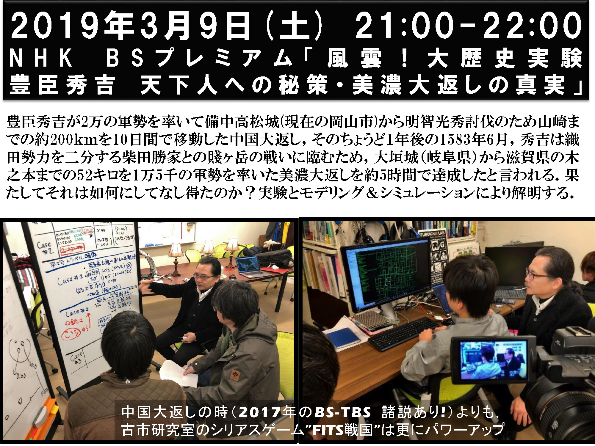 数理情報工学科の古市研究室が制作に協力した番組「風雲!大歴史実験 豊臣秀吉 天下人への秘策・美濃大返しの真実」が2019年3月9日(土)21:00-22:00に放送されました.見逃した方は,再放送をご期待ください.NHKオンデマンドで視聴することもできます.
