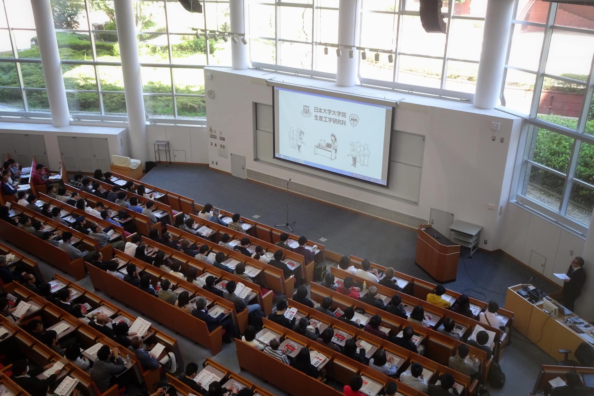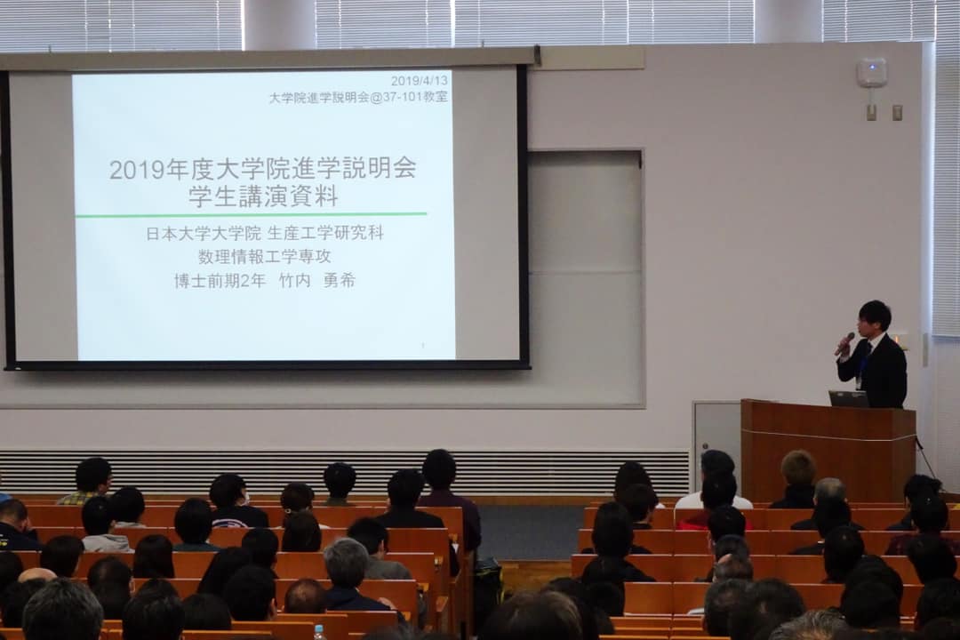 2019年4月13日(土),日本大学大学院生産工学研究科では学部4年生向けに大学院進学説明会を実施し,多数の学生及びご父母の皆さまにご参集いただきました.説明は数理情報工学研究科の見坐地教授他が行い,経験談を大学院2年の竹内君(細川研究室所属)他が行いました.今年度の第1期入試は7月6日です,多数の皆さんが大学院へ進学することを期待しています.