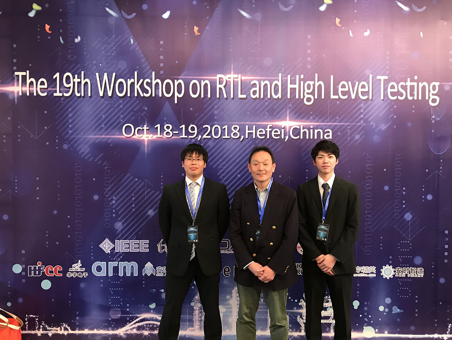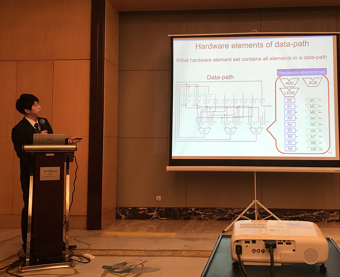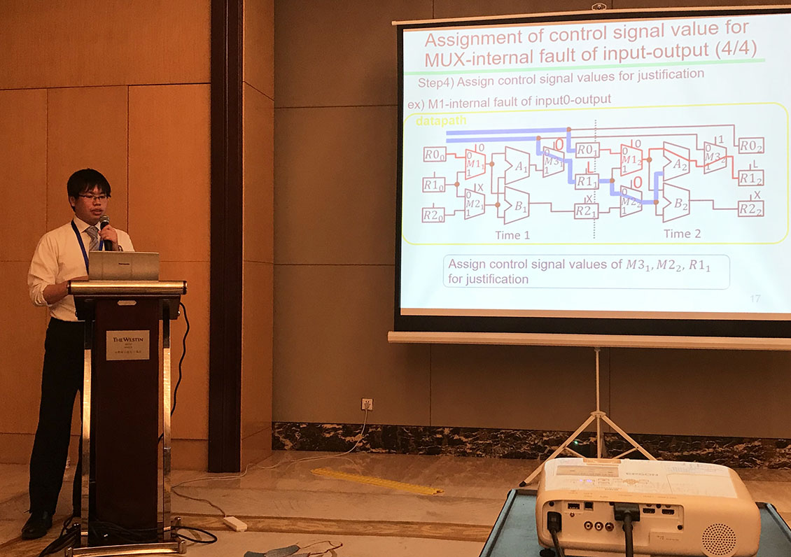 国際会議The 19th IEEE Workshop on RTL and High Level Testing (WRTLT2018)が2018年10月18~19日に中国・合肥・Westin Hotel Baohe Hefeiで開催され,数理情報工学専攻の大学院博士前期課程1年の石山悠太さん(細川研究室所属)の論文 ” A Controller Augmentation Method for k-cycle Capture Test Generation Using Partial Scan Designs” と,大学院博士前期課程1年の竹内勇希さん(細川研究室所属)の論文” A Design for Testability Method to Improve Transition Fault Coverage Using Controller Augmentation at Register Transfer Level”が採択され,発表しました.