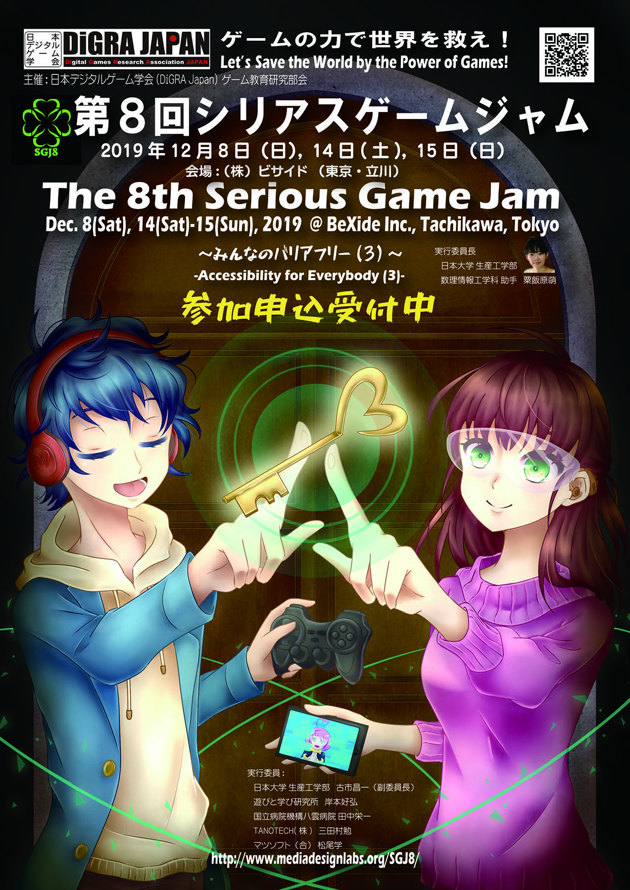 日本デジタルゲーム学会(DiGRA JAPAN)ゲーム教育研究部会では,第8回「シリアスゲームジャム ~みんなのバリアフリー(3)」(略称SGJ8)を2019年12月に東京・立川の(株)ビサイドで開催いたします.SGJ8では,シリアスゲームで解決すべき課題としてゲームのアクセシビリティをテーマとし,障がい者や高齢者と健常者が同じ土俵で競うことができるデジタルゲームを3日間で制作します.ゲームのアクセシビリティに関する専門家(田中栄一先生)及び高齢者のリハビリ現場向けのゲーム開発専門家(三田村勉氏)の知識に,ゲーム開発者や社会人そして学生らの力を結集し,3日間でシリアスゲームを制作します.募集定員は35名と限りがあります,お早めに参加をお申し込み下さい.また,新聞,雑誌,TV等の取材も承ります,問合せ先までメール等でご連絡ください.