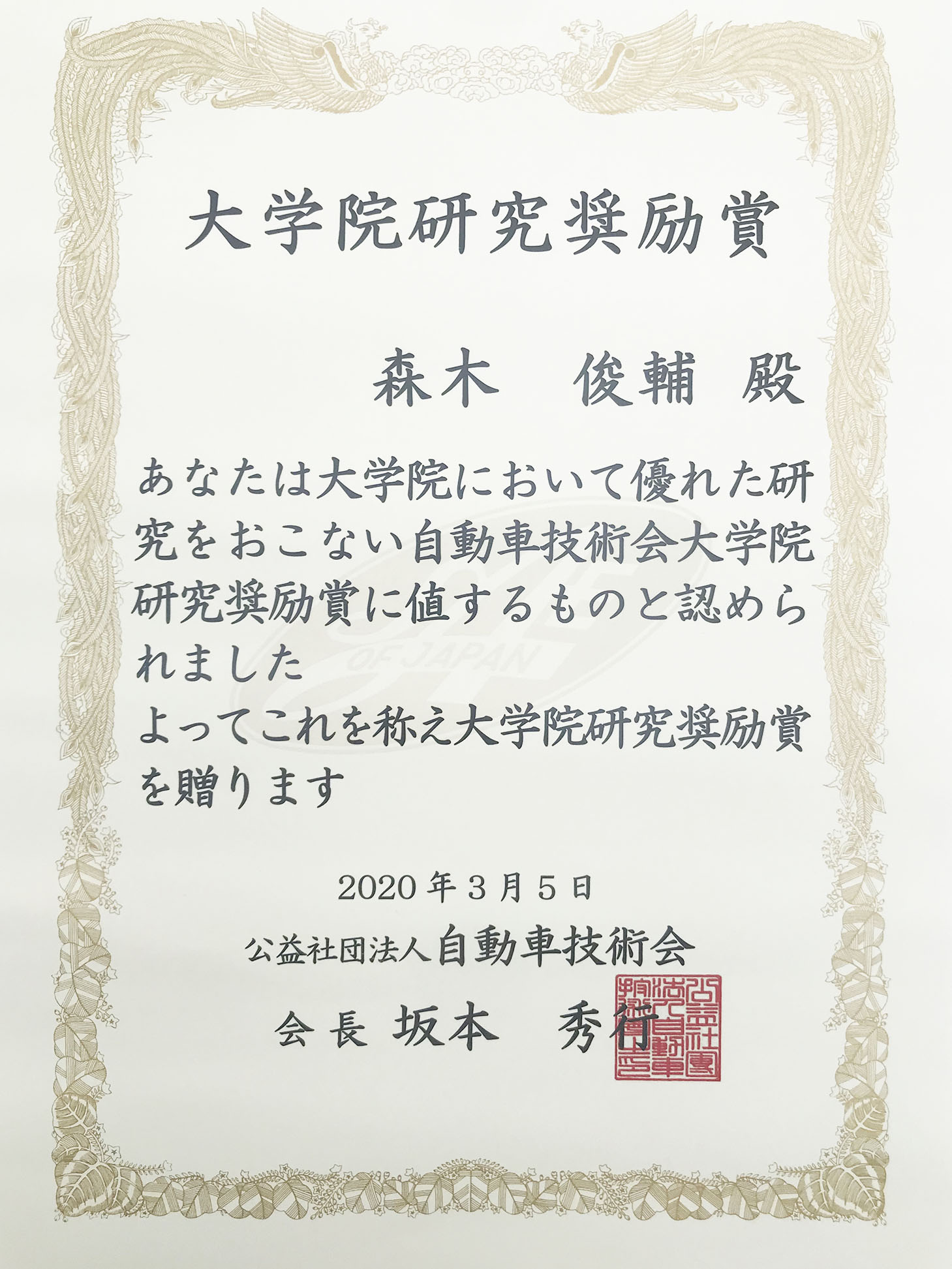 大学院2年生の森木俊輔君(見坐地研究室所属)が,公益社団法人自動車技術会「2019年度 大学院研究奨励賞」を受賞しました.本賞は大学院生の学業の向上発展に資することを目的に設けられたもので,森木君の修士論文「多層構造防音材の音響数理モデルと GA を用いた吸音/遮音/固体播音特性最適化に関する研究」は自動車の静粛性向上と軽量化による低燃費を高次元で両立する技術として高い評価を受けたことから,表彰されました.