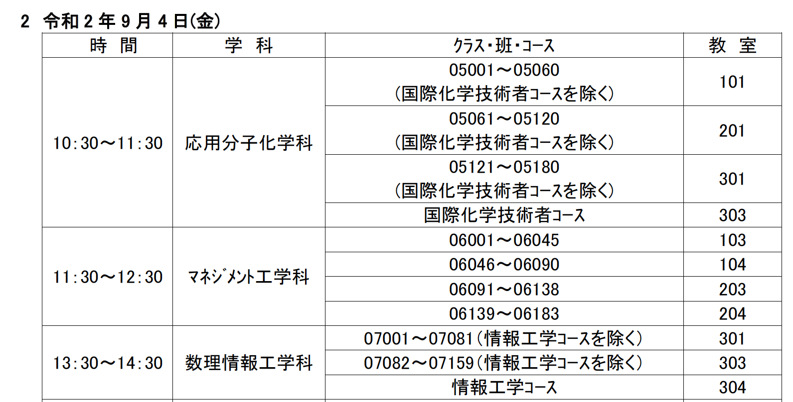 9月4日(金)に実籾校舎で行われるガイダンスの実施教室は次のとおりです.詳細はポータルシステム上で配布されているガイダンス資料を確認してください.
