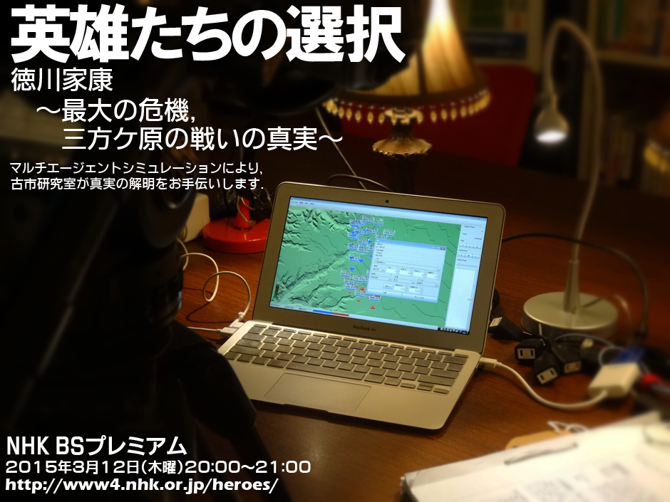 2015年3月12日(木曜日)20:00~21:00,NHK BSプレミアムの「英雄たちの選択」に数理情報工学科の古市先生が研究室の学生達と一緒に出演しました.番組中で,徳川家康と武田信玄が戦った三方ヶ原の戦いの真実を明かすコンピュータシミュレーションの専門家として古市先生は登場します.最近発見された新資料にもとづいて数理情報工学科の学生が開発したコンピュータシミュレーションにより三方ヶ原の戦いを再現し,歴史家の磯田道史先生を中心に,考古学者の千田嘉博先生,哲学者の萱野稔人先生,歴史学・国際政治学者の小谷賢先生,脳科学者の中野信子先生が語ります.見逃された方は,NHKオンデマンドでご覧になることもできます!