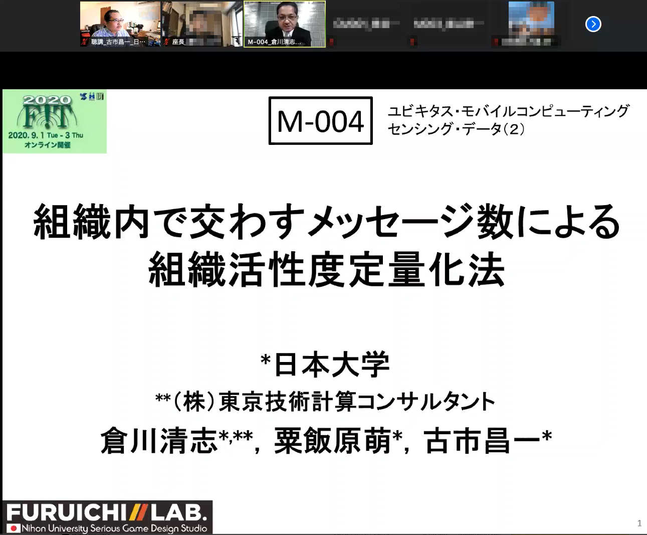 9月初旬は毎年学会発表のシーズンで,数理情報工学科及び数理情報工学専攻の学生は様々な学会で日頃の研究成果を発表します. 2020年9月1日から3日に開催されている情報処理学会電子情報通信学会共催による情報科学技術フォーラムFITでは,9月1日には博士後期課程1年の倉川清志君が「組織内で交わすメッセージ数による組織活性度定量化法」というタイトルで発表しました.倉川清志君は(株)東京技術計算コンサルタントの社長を務めながら大学院で学ぶ社会人ドクターの学生で,学会発表は今回が初めてとのこと.質問2件に対する受け答えも適切に対応することができました.次の目標は査読付き論文の採録と国際会議での発表を目指すとのことです.