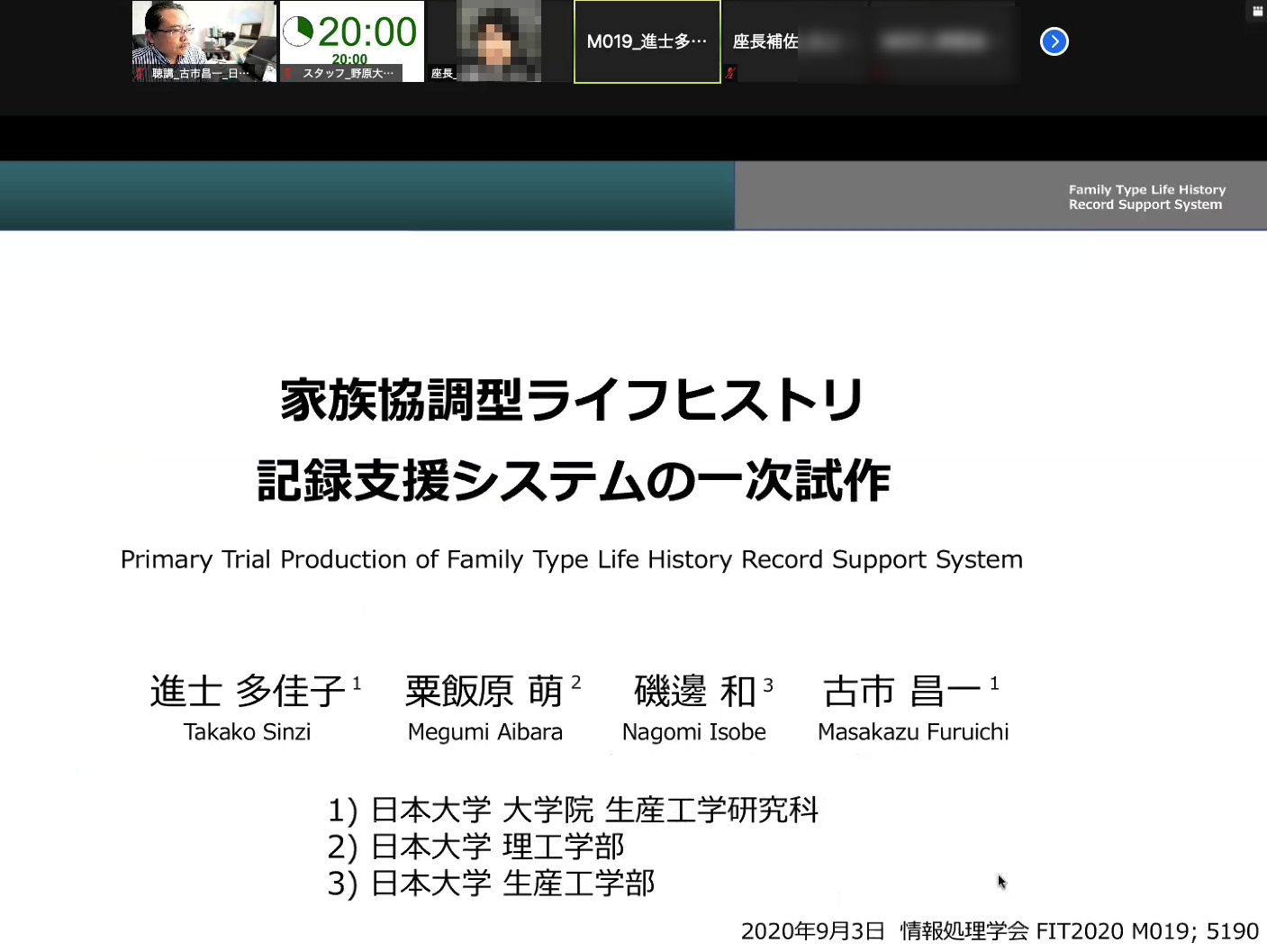 9月初旬は毎年学会発表のシーズンで,数理情報工学科及び数理情報工学専攻の学生は様々な学会で日頃の研究成果を発表します. 2020年9月1日から3日に開催されている情報処理学会と電子情報通信学会共催による情報科学技術フォーラムFITでは,9月3日に博士後期課程1年の進士多佳子さんが「家族協調型ライフヒストリ記録支援システムの一次試作」というタイトルで発表しました.本研究は,別居中の高齢者がいる家族間でのコミュニケーションを促進するとともに,コミュニケーションの成果をライフヒストリとして電子的に蓄積することにより,家族にとって重要な情報や知識の共有を可能とするのを目的としたものです.