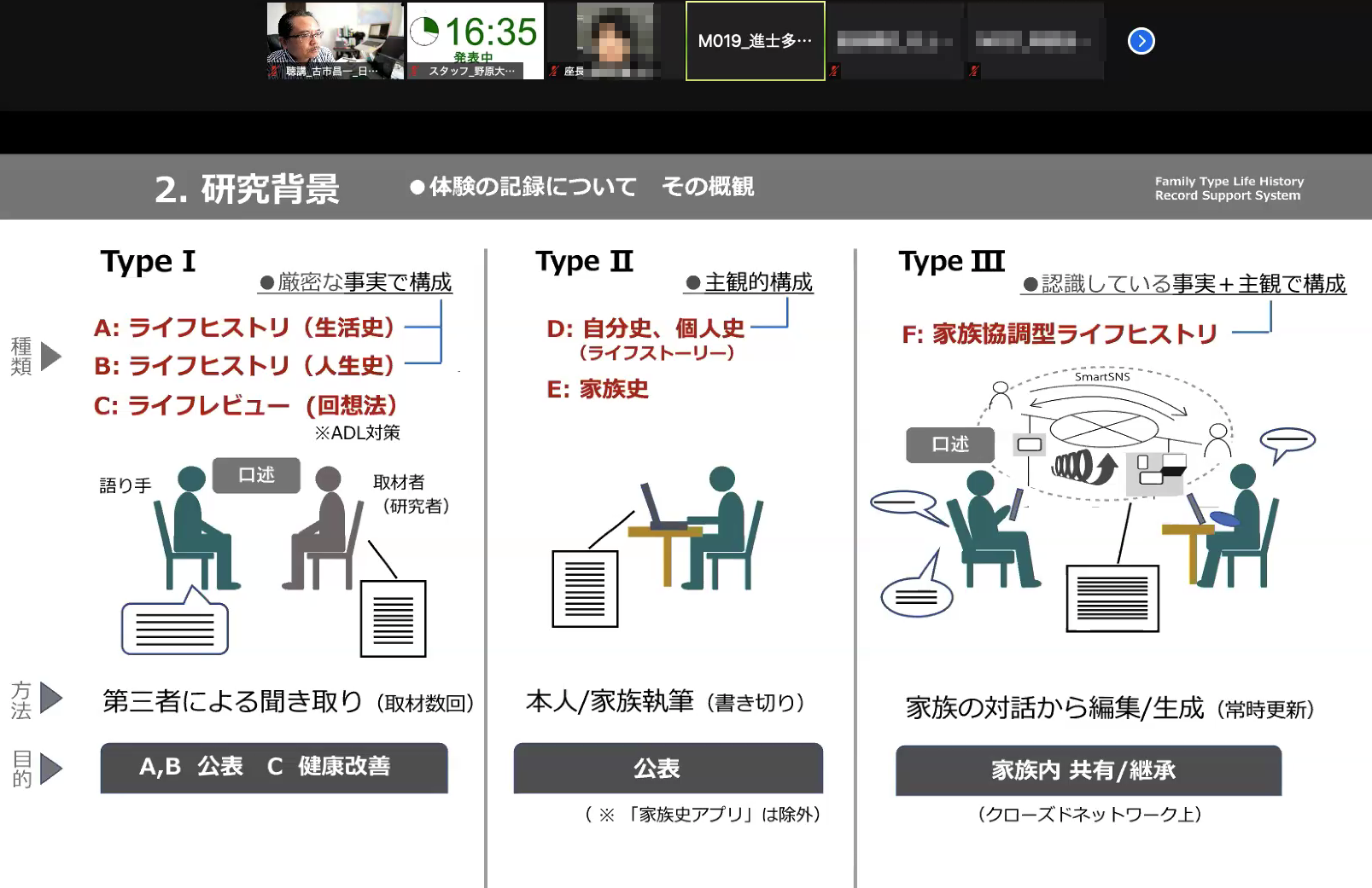 今回の発表では家族間だけで共有するライフヒストリについての発表でしたが,質疑応答時には家族外での利用の予定を問われ,次の段階の研究ではこの機能を盛り込んでいる旨回答しました.