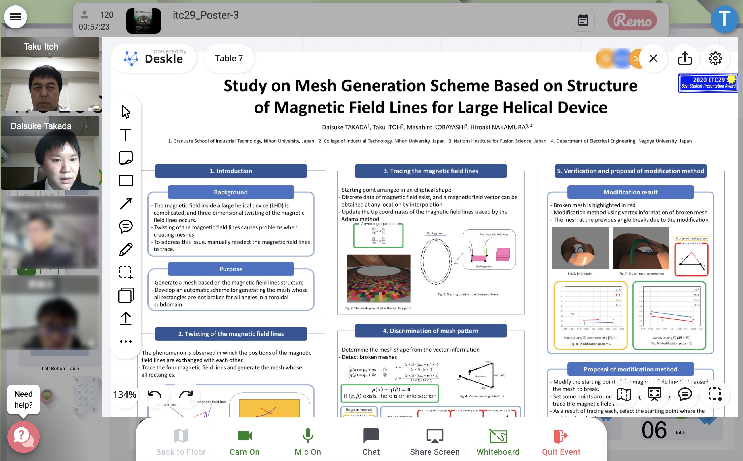 髙田さんの発表は,LHD (Large Helical Device)内部における磁束線に沿ったメッシュ分割に関するものです.本研究では,主に幾何学的アプローチによってメッシュが壊れた場合でもそれを検知し,自動的に修正するためのアルゴリズムを提案しました.自動メッシュ分割ができれば,LHD内部でのシミュレーションを始める際の準備が容易になります.従来,メッシュが壊れた際に手動で修正が必要であったため,それを解消するためのチャレンジングな発表でした.本研究の内容は,発表中にいただいた質問やご意見等を参考にさらに拡充され,フルペーパーとして投稿予定です.