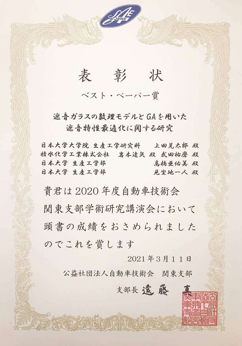 【受賞論文】 ★「遮音ガラスの数理モデルとGAを用いた遮音特性最適化に関する研究」 日本大学(生産工) 上田晃太郎,髙橋亜佑美,見坐地一人 積水化学 岩本達也,武田祐磨