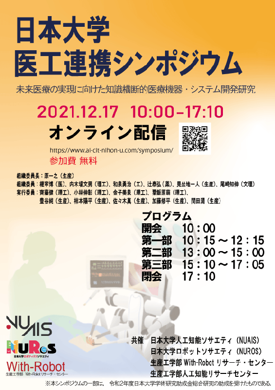 令和3年度「日本大学 医工連携シンポジウム」が日本大学人工知能ソサエティ(NUAIS)、日本大学ロボットソサエティ(NUROS)、生産工学部With-Robot リサーチ・センター、生産工学部人工知能リサーチセンターによる共催で、令和3年12月17日(金)にオンラインにて開催されます.数理情報工学科の見坐地一人教授が組織委員,数理情報工学科の出身で現在理工学部の粟飯原萌先生が実行委員を務めています. 詳細はこちらをご覧ください.