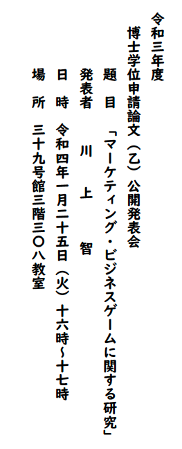 2022年1月25日(火)16:00-17:00に川上智氏の博士学位申請論文(乙)の公開発表会が行われます. 川上智氏は数理情報工学専攻博士後期課程に社会人学生と在学中に経営学を学ぶ学生のための教育・演習及び経営者のための演練を目的としたマーケティング・ビジネスゲームを開発し,本公開発表会ではその研究成果を発表します.また,川上智氏は現役自衛官でもあり,在学中にはNHK総合のTV番組「歴史探偵 -黒船来航- 」では専門家として出演されました.