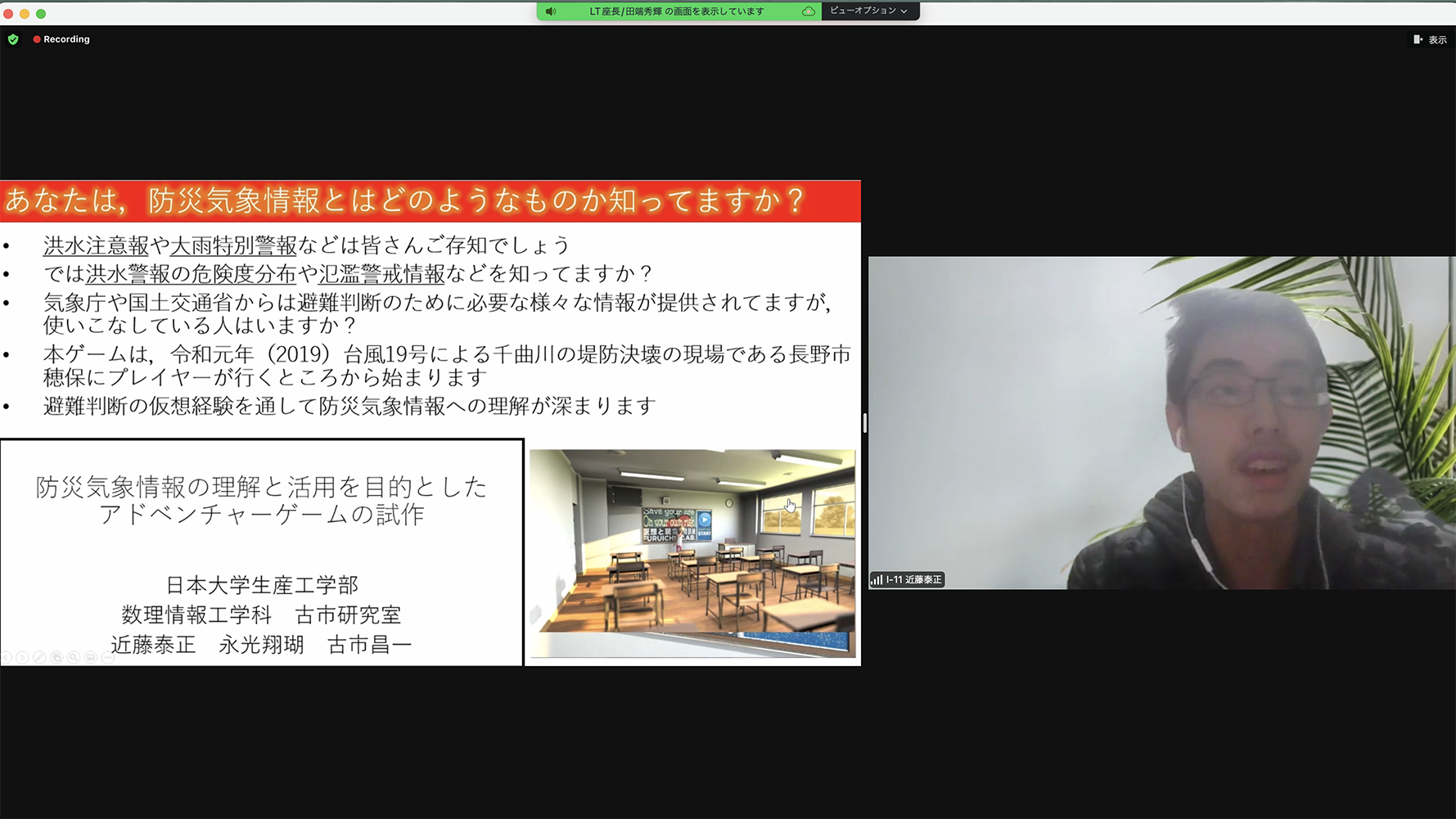 また,「防災気象情報の理解と活用を目的としたアドベンチャーゲームの試作」の筆頭著者近藤泰正君(情報工学コース)は,学生奨励賞を受賞しました.おめでとうございます.