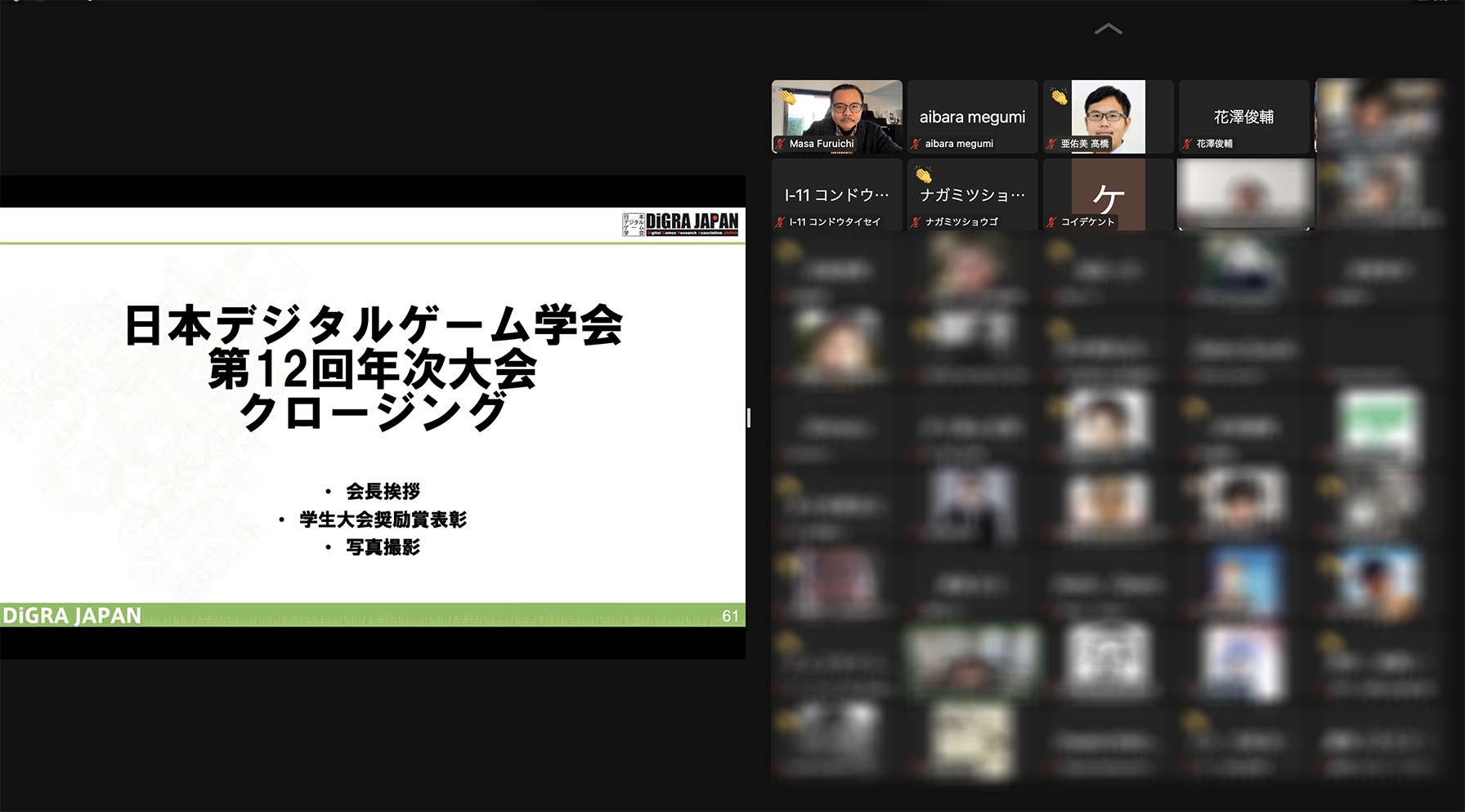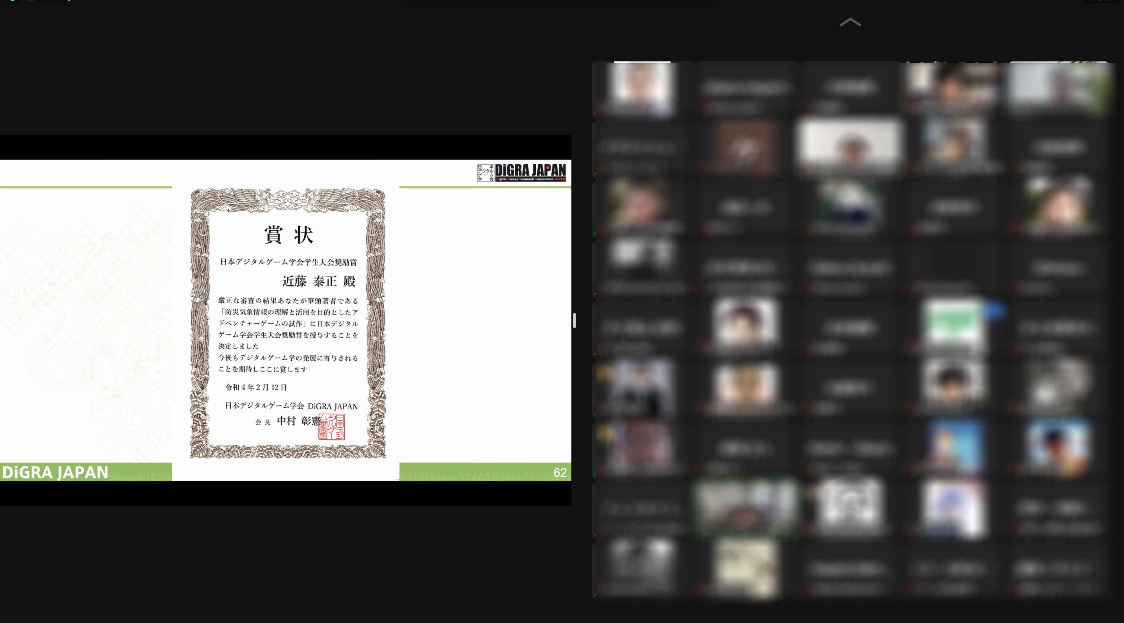 春休み中数理情報工学科の一部の学生は日頃の研究成果を学会で発表します. 2022年2月11日〜12日に開催された日本デジタルゲーム学会第12回年次大会には,髙橋亜佑美先生が大学院におけるプロジェクト演習型講義の成果を「PBL型演習におけるeスポーツイベントの試み」というタイトルで発表した他,古市研究室の3年生の学生3グループがそれぞれ「メディアリテラシー教育を目的としたWebゲームの試作」,「防災気象情報の理解と活用を目的としたアドベンチャーゲームの試作」,「Clusterを利用した空間把握能力向上を目的としたシリアスゲームの試作」というタイトルで,数理情報工学演習という通年科目で実施した研究成果を発表しました.