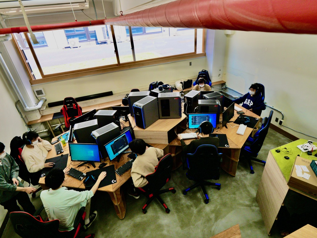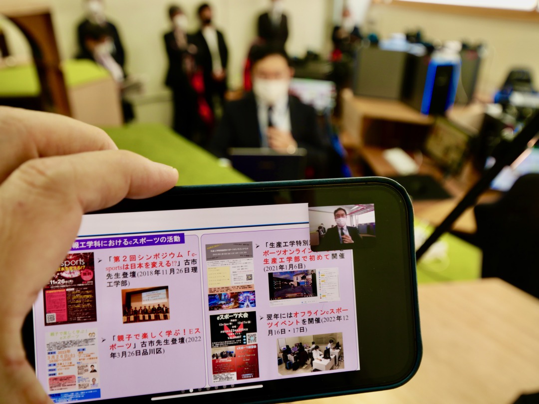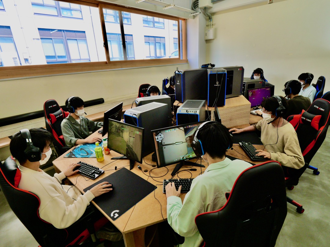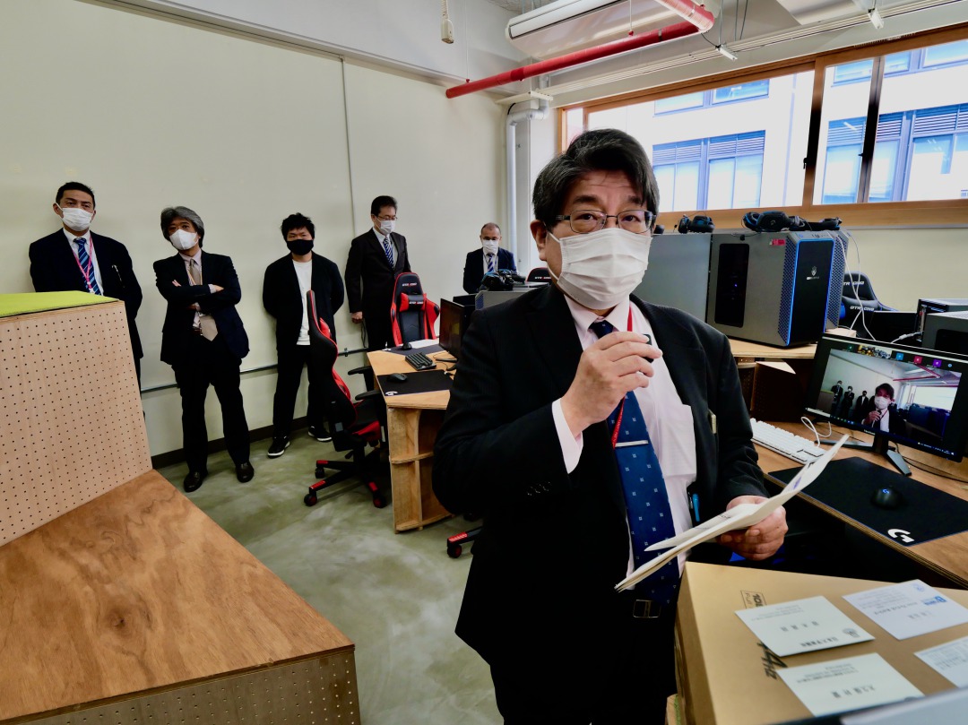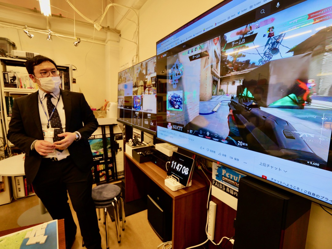 2022年4月12日(火)10:30,学生と教職員が待ち焦がれていたeSports Studioが23号館102室に完成し,澤野利章学部長による挨拶によりオープニングが宣言されました! 当日はメディアの方も会場及びオンラインの中継にお集まりいただき,日本大学生産工学部eSportsサークルの学生達による模範演技をYouTube Liveで配信しました.今後本スタジオがゲームのチカラを世界に発信する本拠地となり,eSportsのプレイを楽しむ学生や教職員のための場を超え,老若男女・障害者と健常者等様々なバリアを超えて共通の土俵で競い,楽しみそして学ぶ場として利用されることが期待されます.