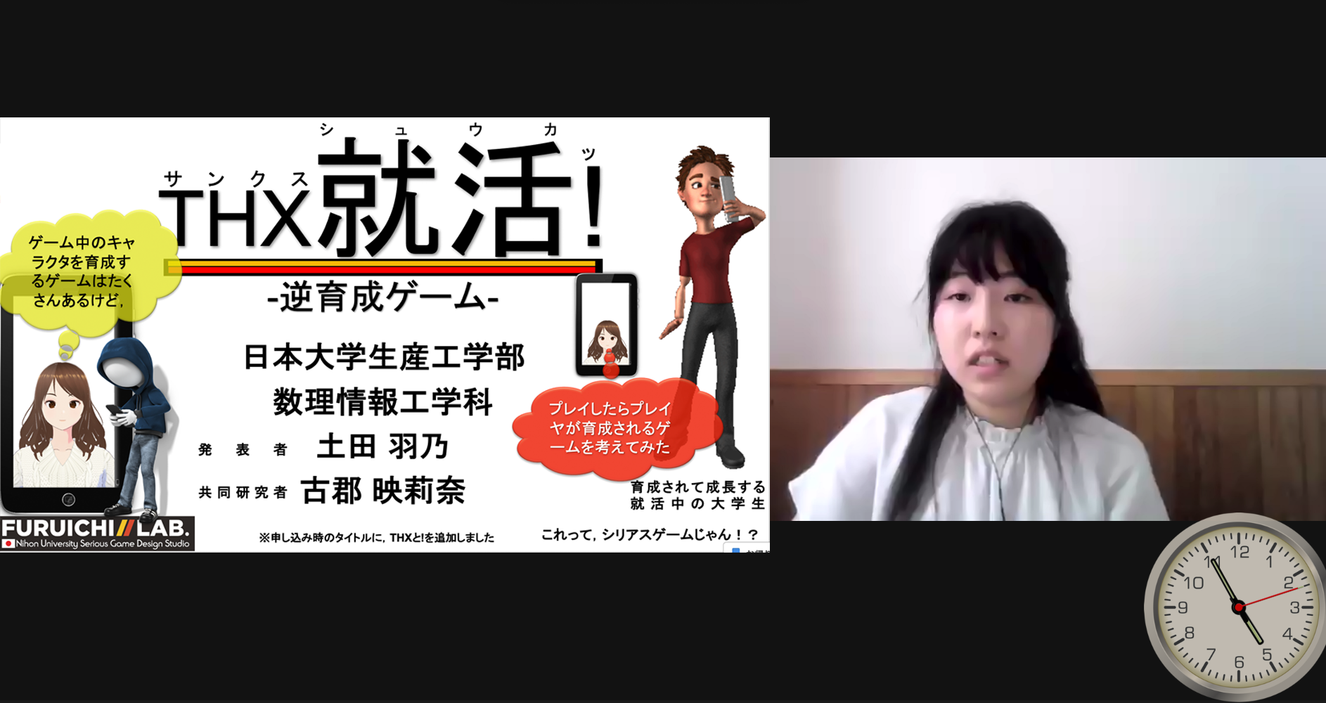 タイトルは「THX就活!逆育成ゲーム」(*THXはサンクスと発音)で,今年度中の一般公開を目指して現在開発中のシリアスゲームの企画書を発表したものです.大学院生や4年生がこの時期学会発表するのは普通ですが,3年生で発表するのは珍しいのではないかと思います. 今回発表することによって, チャットボット型のアプリ開発に効果的なツールに関する情報や,発話データから感情AIを使ってプレイヤの感情を識別する方法に関する情報を聴講者の皆さんから教えていただき,これから研究を本格化する上でとても良い機会でした.来年2月の完成と2回目の学会発表を目標として,チームで頑張るとのことです!