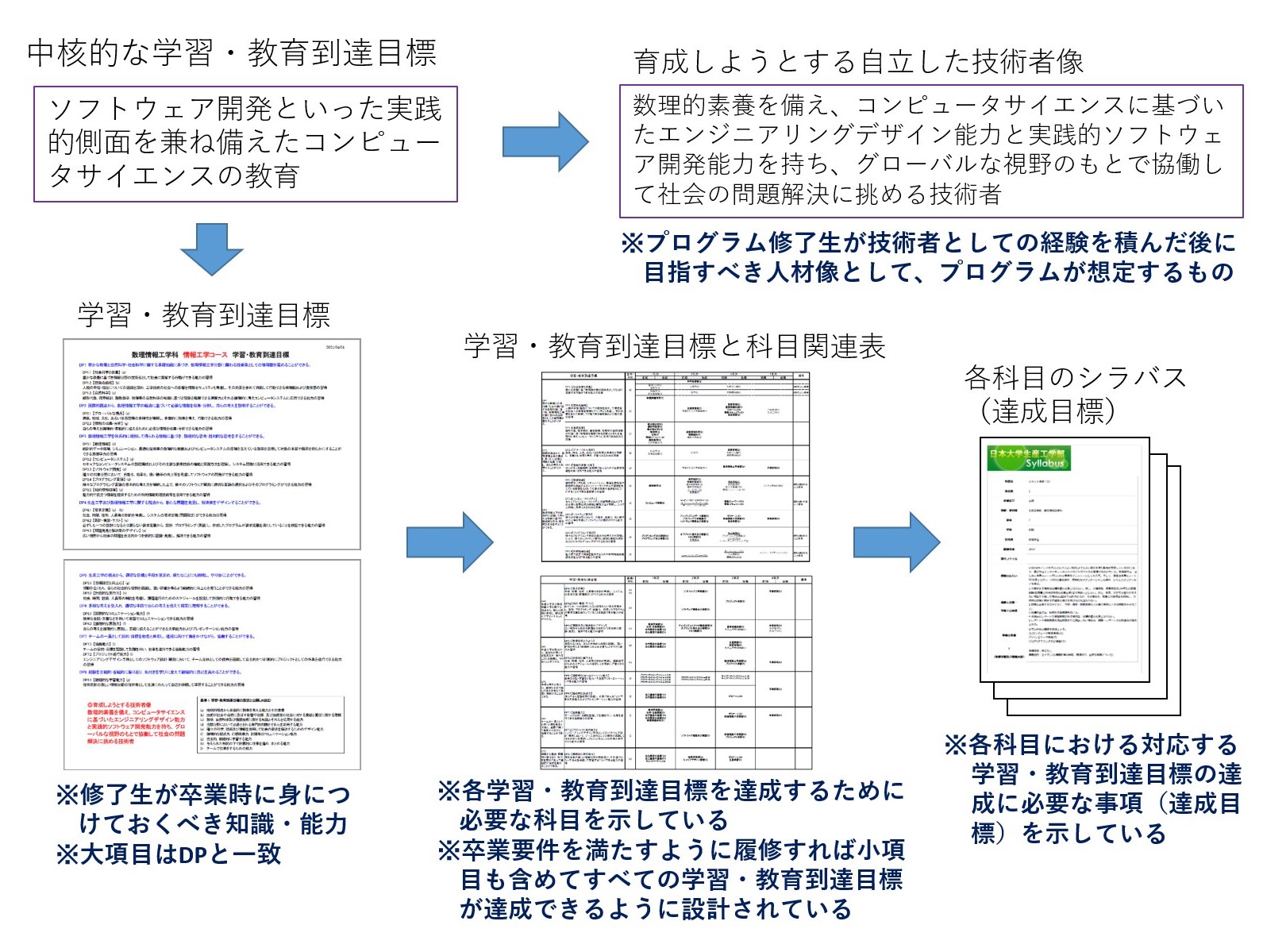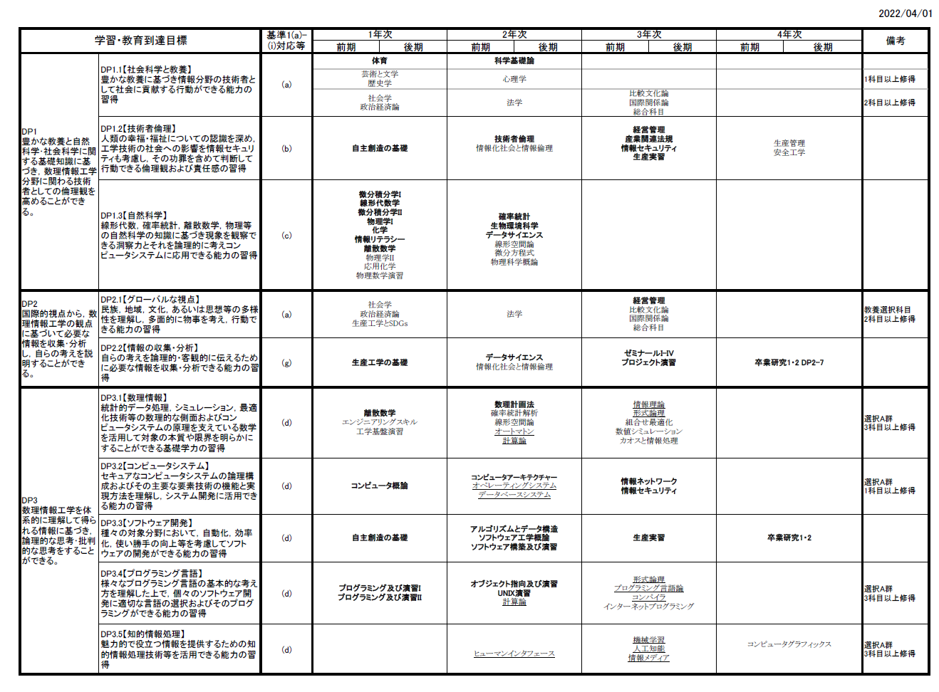 本プログラムの学習・教育到達目標は、大項目を学科のディプロマ・ポリシーと一致させ、各大項目にいくつかの小項目を定めています。このため、本プログラムでは、学生が4年間で卒業要件を満たすように128単位修得することにより、いずれの選択科目の組合せでも学習・教育到達目標の大項目だけではなくすべての学習・教育到達目標の小項目を達成できるようにカリキュラムを設計しています。