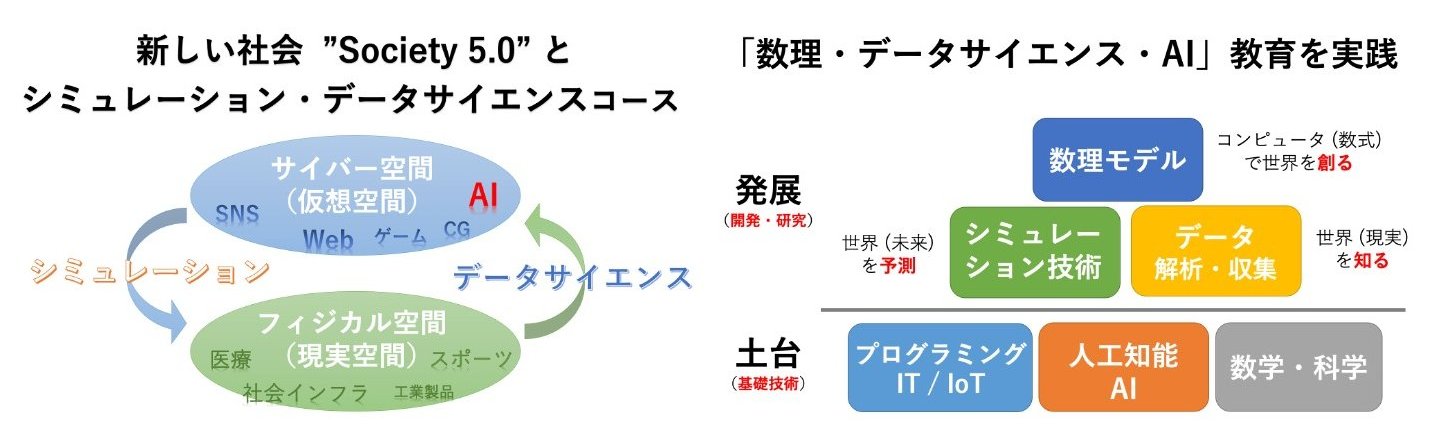 ミュレーション・データサイエンスコースでは、AI(人工知能)に代表されるIT(情報技術)と、それらを理解して活用するために必要な数理的能力を身につけます。日本と世界が目指す新しい情報化社会では、「シミュレーション」と「データサイエンス」が仮想空間と現実空間を繋ぐ大切な役割を果たします(左図)。本コースでは、これらの最先端技術を実践・開発・研究する上で必要な科目が、他コースや他大学に類を見ないほど充実しています。また、これらを学ぶための基礎となるプログラミングや数学を一から着実に学ぶことができます(右図)。