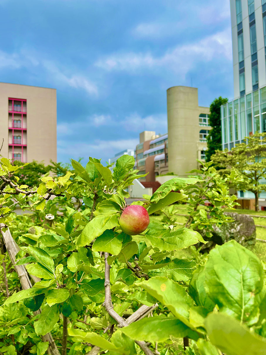 数理情報工学科の建物のまわりには多くの学生達の憩いの場がありますが,その一つが,ニュートンのりんごの木です.2023年6月23日(金),ついにりんごが5個実をつけました!落下するのは,おそらくあと10日後です.その瞬間を動画に記録した方は,ぜひとも数理情報工学科の事務室までご報告いただければと思います 😉