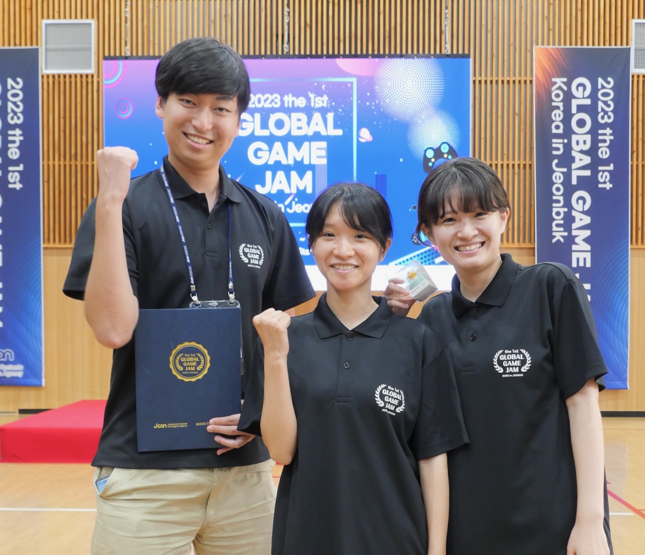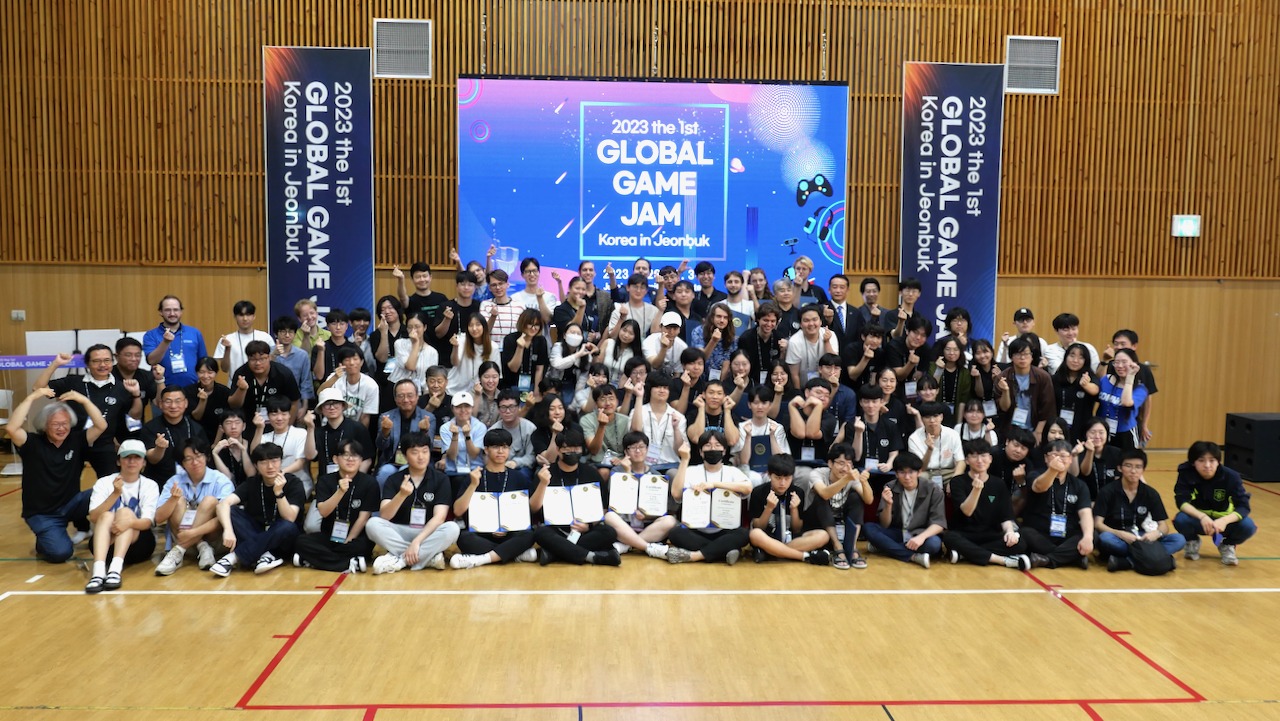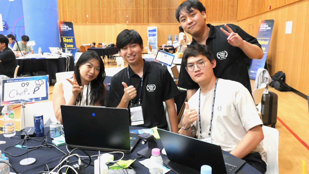数理情報工学科にはゲーム開発に興味のある学生が毎年たくさん入学します.入学後はプログラミングの基礎等やゲーム開発には欠かせない数学,物理,そして人工知能,コンピュータグラフィックス,アニメーション等を学び,3年生ではチームでゲーム開発を行って世界に向けてストアでリリースして実績を積みます.次に,一部の学生はその腕を試すために世界各地で行われるゲーム制作を行う国際大会等にも参加します.今年はコロナ禍が明け久しぶりに対面型の国際大会「全州大学グローバルゲームジャム」が韓国で行われ,4年生の学生3名が参加してきました.今回日本大学から参加したのは生産工学部数理情報工学科 古市研究室の3名に加え,理工学部応用情報工学科 松野研究室の3名が参加した他,日本からは東京大学文学部 吉田研究室の4名も参加し,担当の古市先生によると国際大会に日本からの参加者が10名を超えるのは今回がゲームジャム史上初であろう,とのことです.