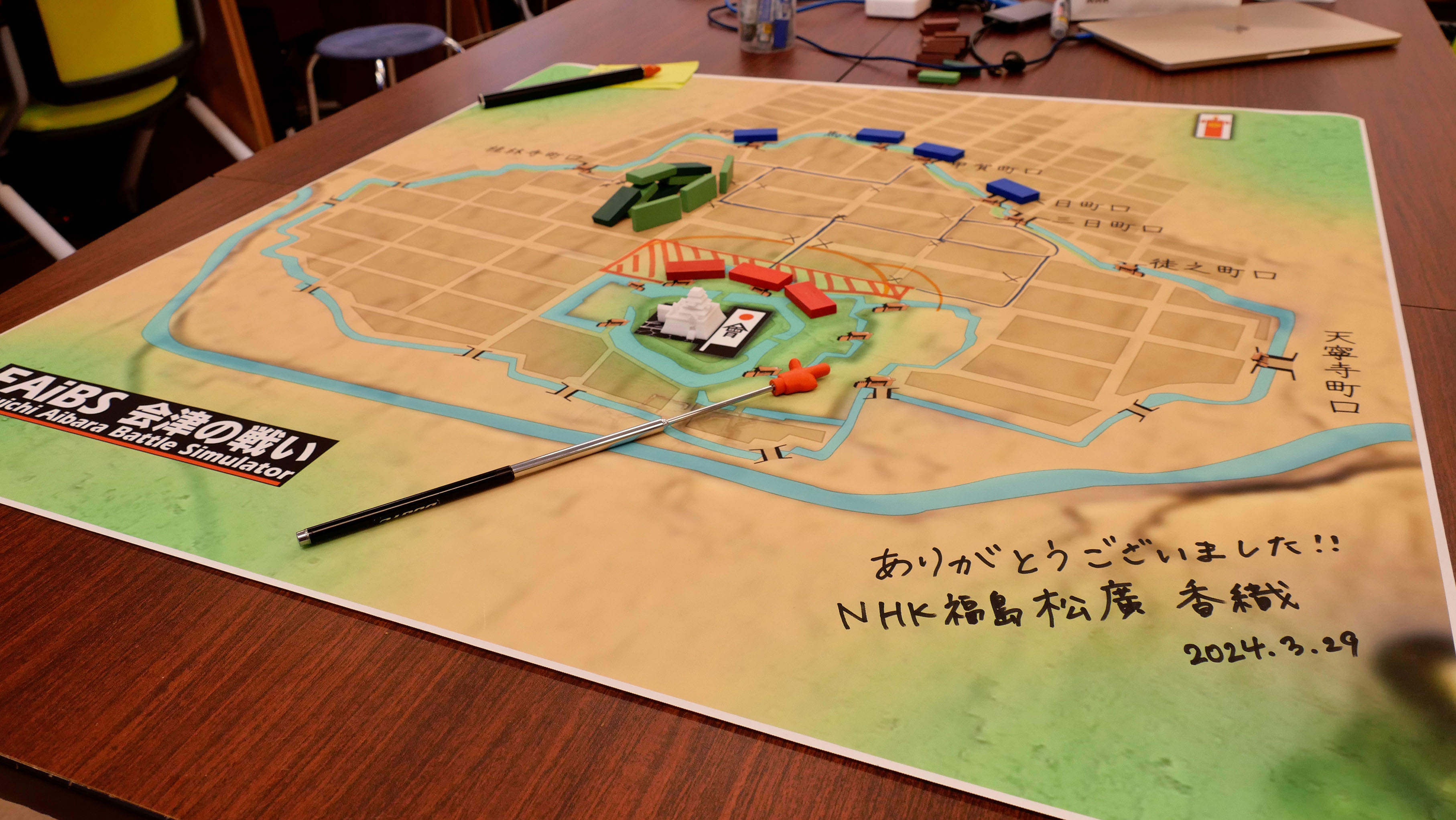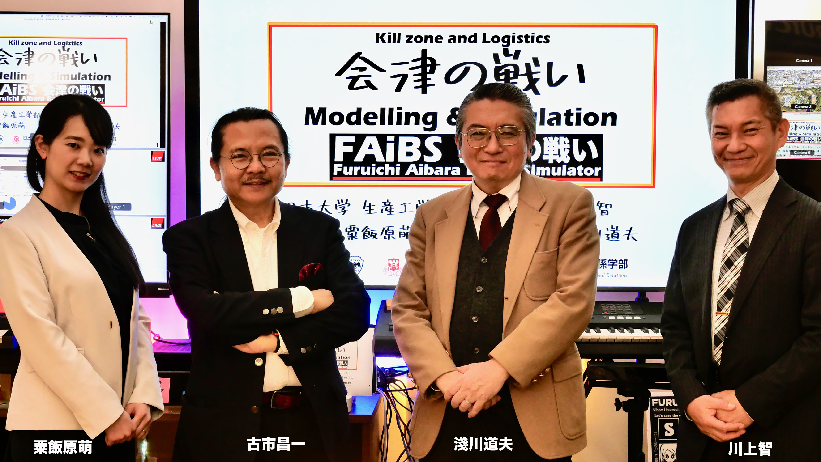 「歴史探偵 戊辰戦争と会津の戦い」制作への協力にあたっては,2024年1月にNHK福島局からの問い合わせを受け,FAiBS(Furuichi Aibara Battle Simulator)の新作開発がはじまりました.開発にあたっては, 理工学部精密機械工学科の粟飯原先生と生産工学部数理情報工学科の古市先生が中心となり,地図制作や城の3Dモデル制作は数理情報工学科のメディアデザインコースの2年生(当時)が協力し,戊辰戦争での激戦の一つ「会津の戦い」を再現し,2024年3月29日に古市研究室で収録を行いました.また,軍事史が専門で日本大学国際関係学部国際総合政策学科教授の淺川道夫先生と,古市研究室の川上智上席客員研究員(元海上自衛官)も一緒に開発に加わり,当日は全員が古市研究室に集合して半日かけて収録を行いました.
