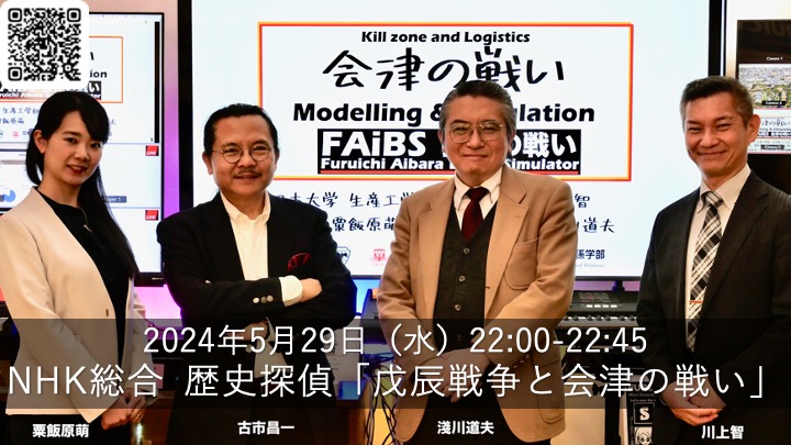福島地方限定ですが,NHK総合で「歴史探偵 戊辰戦争と会津の戦い」が2024年9月20日(金)19:57-20:42に再放送されます.一回目の放送は2024年5月29日(水)22:00-22:45,生産工学部数理情報工学科の古市特任教授,理工学部精密工学科の粟飯原助教(生産工学部の出身).国際関係学部の淺川教授らが出演しました.これまでの番組では,「シミュレーション開始!」の1声は古市先生が放ってましたが,今回は松廣香織アナウンサーが発声.新政府軍と会津軍の市街戦の再現部分を担当しました.