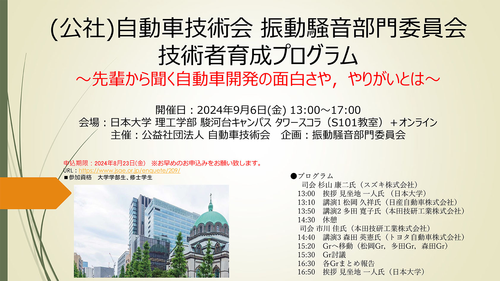 自動車業界に興味のある学部生&院生の皆さんに,数理情報工学科の見坐地特任教授が委員長を務める(公社)自動車技術会 振動騒音部門委員会主催のイベントを紹介します.