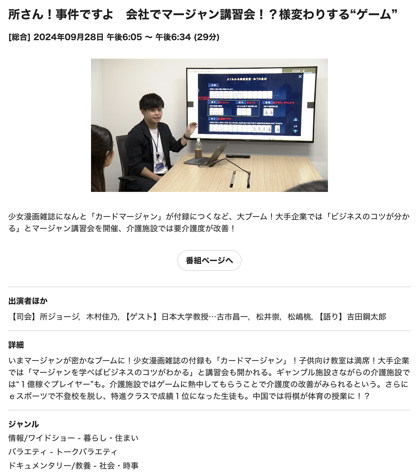 番組名:所さん!事件ですよ 会社でマージャン講習会!?様変わりする“ゲーム”
