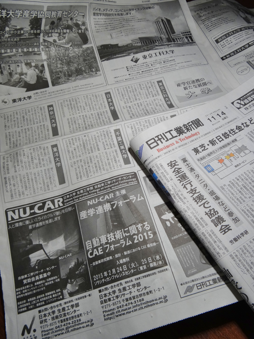 日本大学生産工学部は,「ものづくり」を特色として産業界に近いという強みを持っていることで良く知られてます.これまで45年にわたり,学部3年次に全員が必須科目として体験する外部企業等における生産実習(インターンシップ)を実施している他,企業などからの技術相談や技術指導,委託研究,共同研究などによる産学連携を推進しているのが特徴です. 一般的に,数理情報工学科はIT業界との関係が強いというイメージがあり,それは事実ですが,近年は自動車一台の中に100個を超えるCPUが搭載されている等,数理情報工学は自動車及び電機メーカとのつながりも大変強いというのが強みとなりつつあります.2010年に設立された自動車工学リサーチ・センター(NU-CAR)は2人の副センター長がいずれも数理情報工学科の教授で,それぞれ自動車メーカ及び電機メーカ出身の教授です.このNU-CARが,本日(2014年11月14日)の日刊工業新聞に広告を掲載しました.このような広告からも,生産工学部の強みは産学連携,そして就職にも安心というということが感じ取っていただけることでしょう.