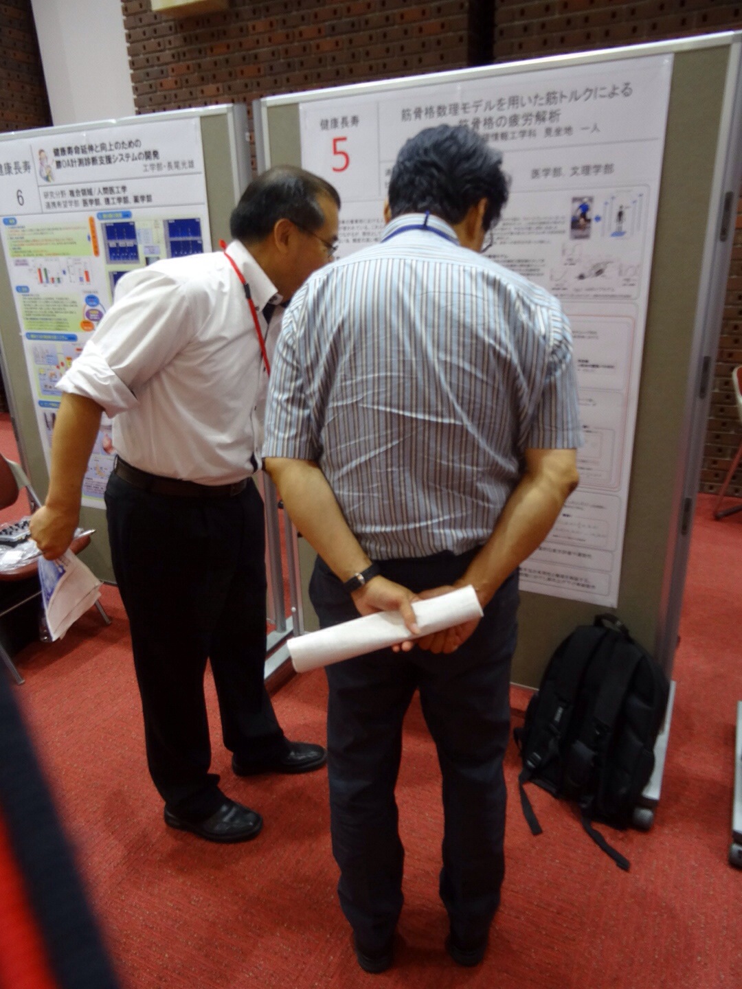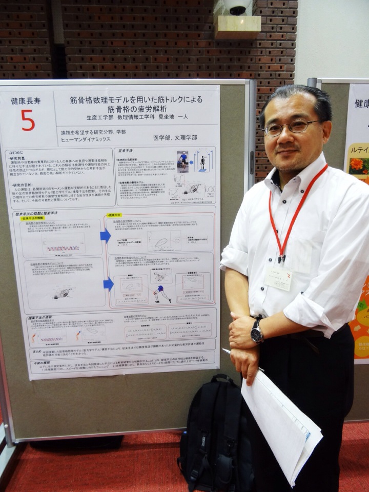 市ヶ谷にある日本大学本部講堂で2014年7月19日(土)に学部連携ポスターセッションが開催され,生産工学部の代表として見坐地先生が発表されました.本ポスターセッションは,日本大学の学部同士が連携して共同研究開発プロジェクトを興すのを目的として毎年開催されるもので,見坐地先生は人体の筋骨格数理モデルについて発表しました.