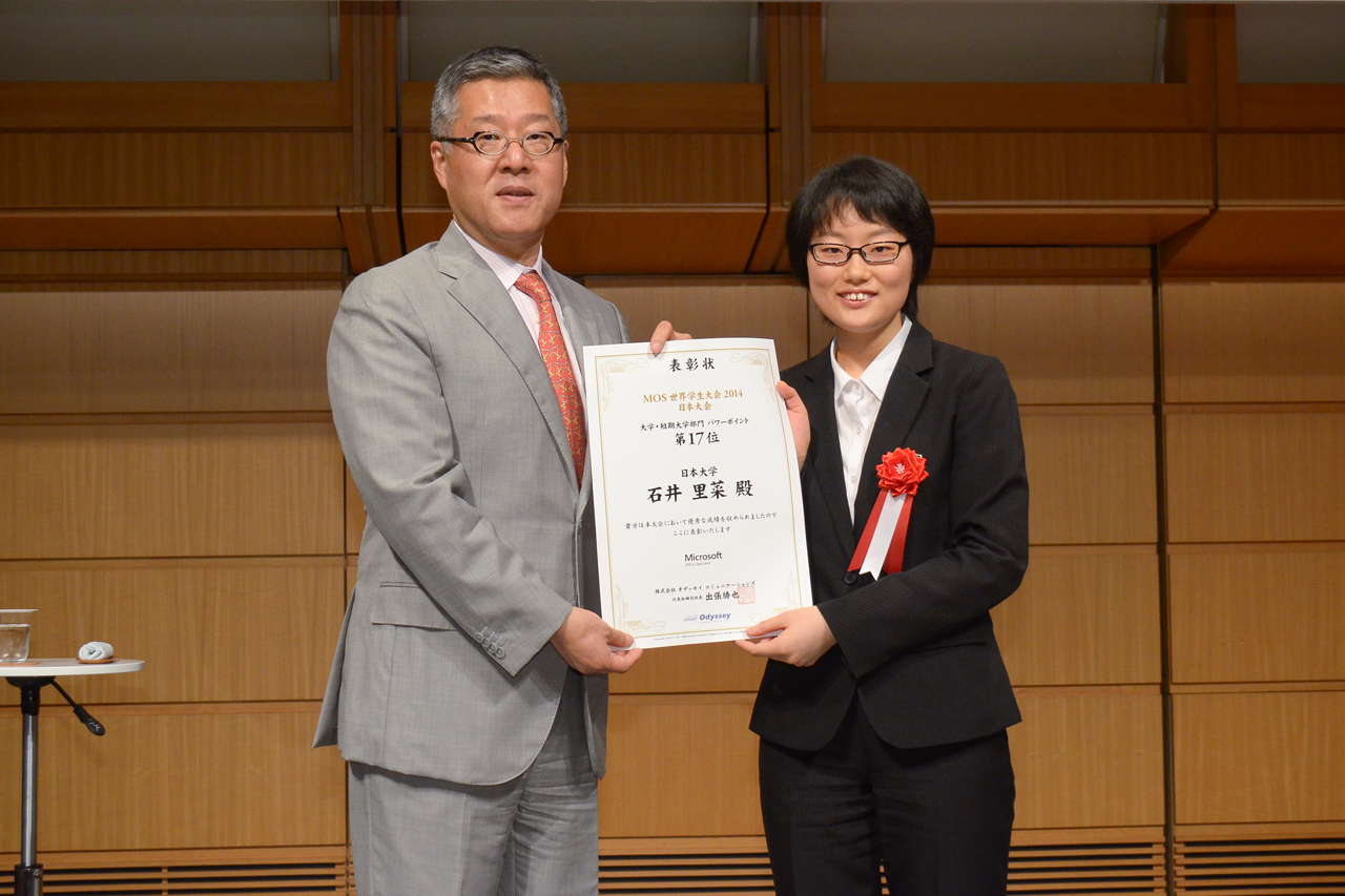 数理情報工学科4年メディアデザインコースの石井里菜さん(中村研究室所属)がMOSのパワーポイント部門第17位になり,6月20日(金)に東京国際フォーラムで開催された「MOS/ACA世界学生大会2014」日本大会で授与式が行われました.