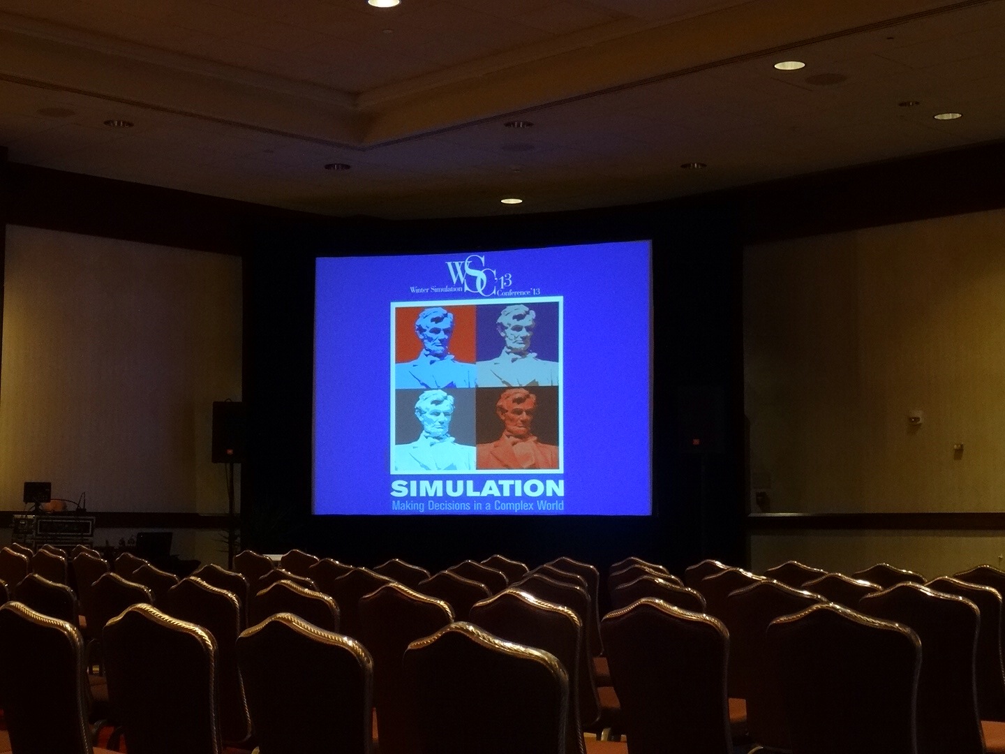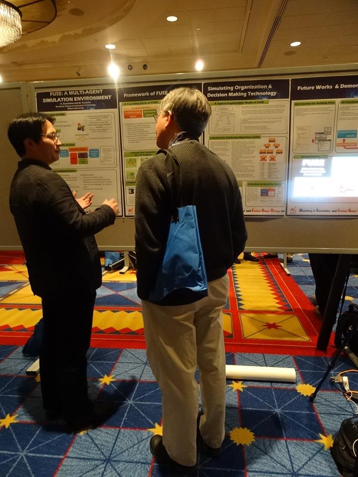 米国ワシントンDCのホワイトハウスの隣接会場(JW Mariotto)で2013年12月8日から11日に開催された国際会議 Winter Simulation Conference 2013で,大学院の学生倉本君が"FUSE: A MULTI-AGENT SIMULATION ENVIRONMENT"というタイトルでポスター発表を行いました.当国際会議は主として社会現象等を対象としたシミュレーション技術に関する世界最大の会議で,約39カ国から約800人の参加者が集まり,約350件の発表が3日間に渡って行われました.倉本君は人間の組織行動をコンピュータ上で再現するためのソフトウェア環境FUSEを構築し,これに関する実現方式と応用例を発表しました.