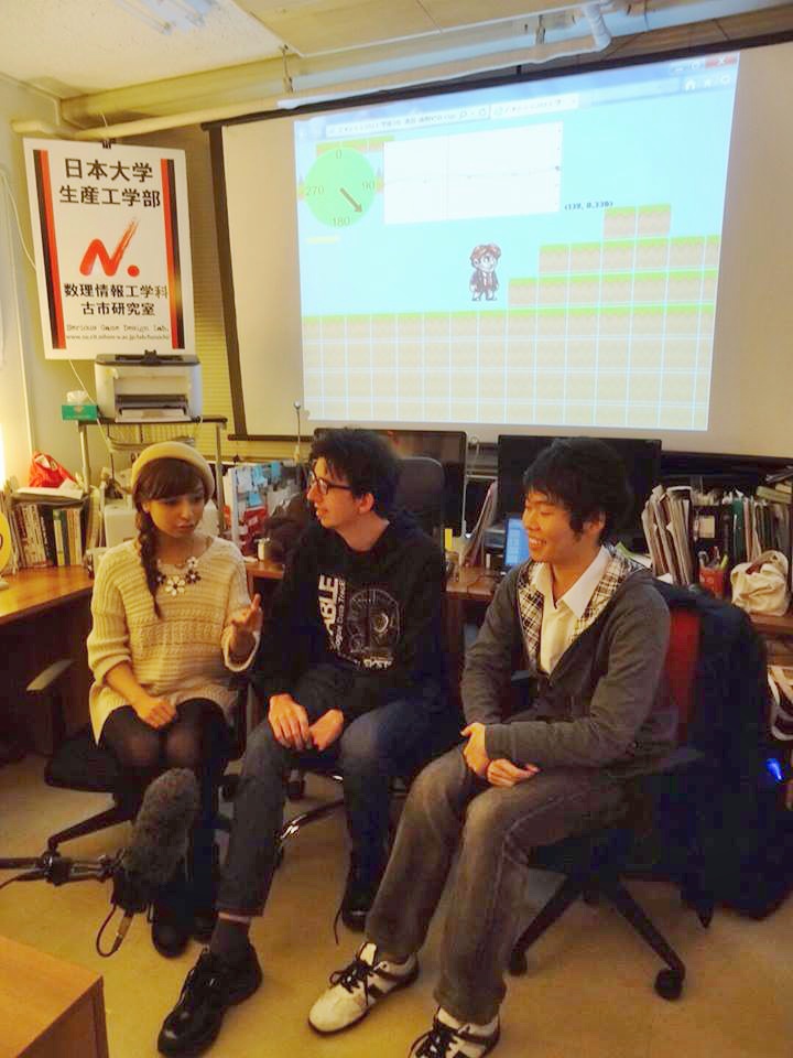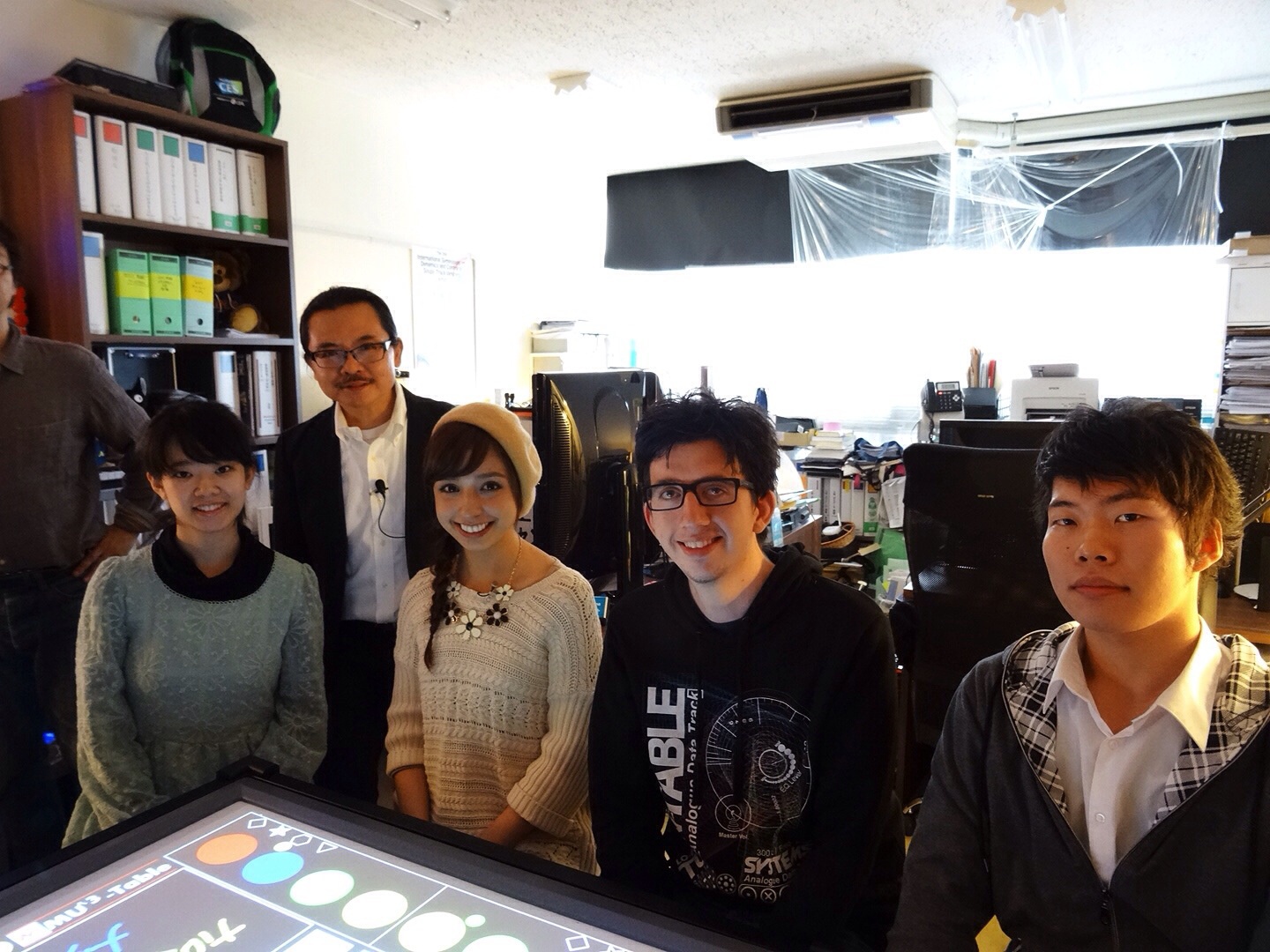本日千葉テレビの番組「キャンパストーク」の収録が生産工学部で実施され,数理情報工学科の学生も多数協力しました.のべときなるみさんがレポータ役の当番組は,千葉県及び周辺の各大学を訪問し,大学生達の様子をレポートしてまわるという番組.数理情報工学科では23号館5階の学生達がシリアスゲームを開発している研究室を訪問し,3年生の学生達とトークしました.たまたまその研究室ではオランダから5か月間来ているスティーブ君と3年生の成田君等が共同で数学教育のためのシリアスゲームを開発しており,なるみさんのレポートはこの二人に集中.また,高齢者の方のコミュニケーションを促進することを目的としたシリアスゲームにもなるみさんは大変興味を持っていただいたようです.放映は11月16日(土)20:30~21:00,お楽しみに!