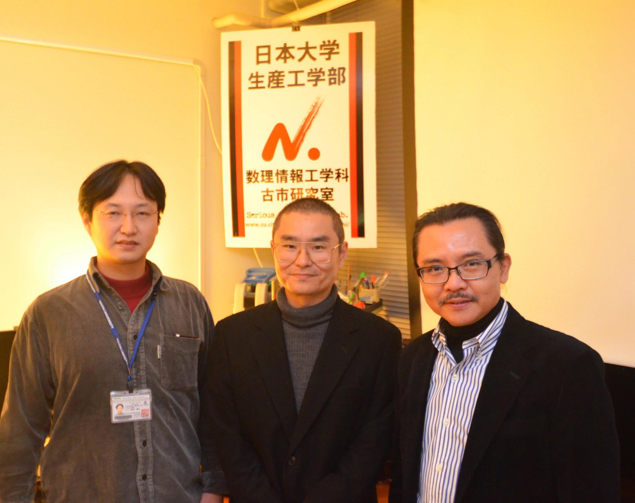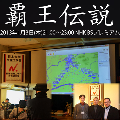 覇王伝説というNHK BSプレミアムの番組収録が,11月末から3回に分けて数理情報工学科で行われ,12月10日に最終回の収録が完了しました.当日の収録は朝11:00から晩8:30まで長時間の撮影となり,見学に来た学生の皆さんもインタビューを受ける等,とても和やかな雰囲気で収録が行われました.放映日は2013年1月3日 21:00-23:00,チャンネルはNHKのBSプレミアムです.司会は爆笑問題のお二人で,歴史の専門家や戦国時代の武将のファンの皆さんが,スタジオで語らいながら理解を深める番組です.これに対して,コンピュータを利用して更に歴史に対する理解を深めようという企画の一環として,歴史家の小和田先生と数理情報工学科の古市先生と大学院生の倉本さんとの3人が一緒になってプログラムを開発してシミュレーションする(モデリング&シミュレーション)様子の収録が古市研究室で行われました.番組中では,戦国時代の武将の戦いを,大学院生が開発した「戦国FUSE」というソフトウェアを用いて,実際には無かった戦いを再現する様子が,ドキュメンタリー風(?)に番組各所に登場することになる見込みです.誰と誰の戦いを実現させるかは,お正月,家族の皆様と一緒にお楽しみください.