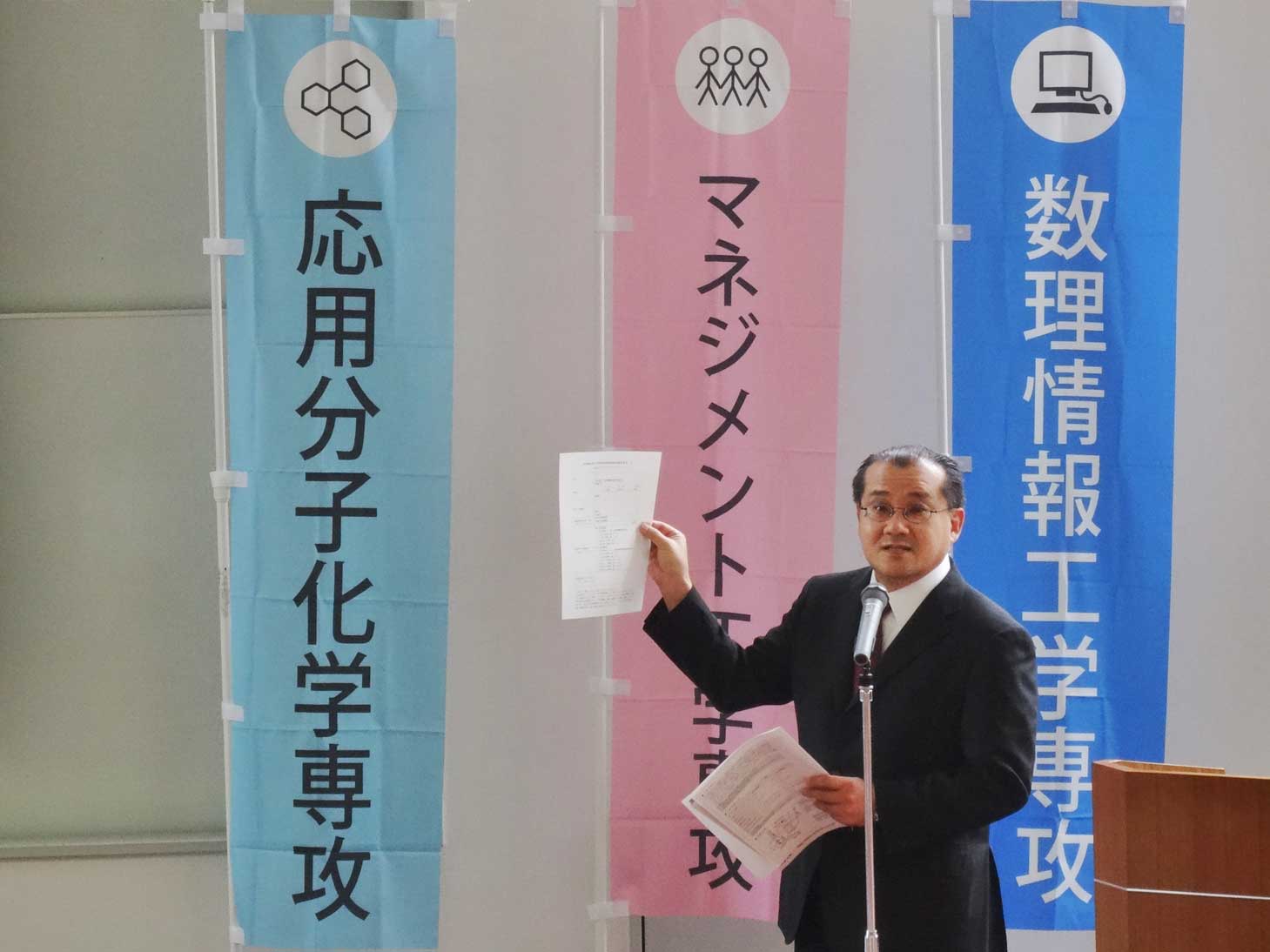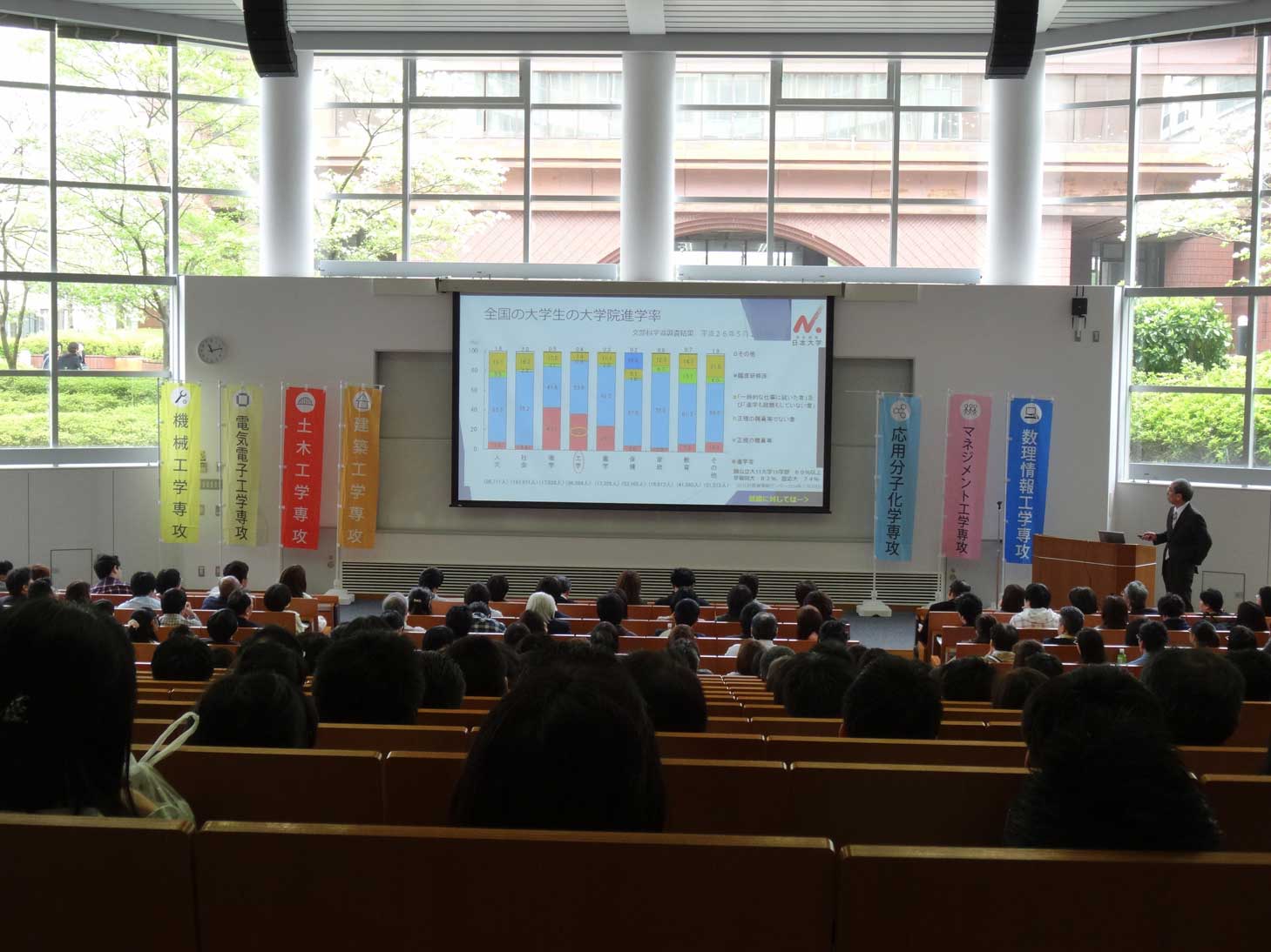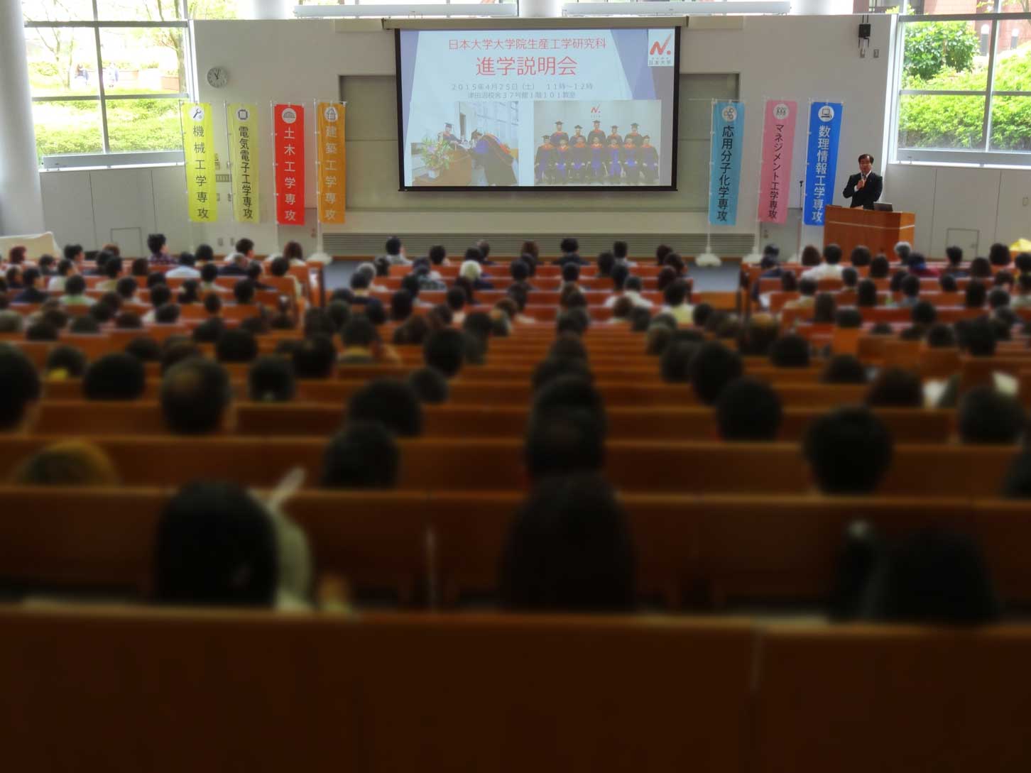 2015年4月25日,生産工学研究科では進学説明会を実施しています.在学中の学生はもちろんのこと,海外からの留学生も参加されているようで,会場は満席です.生産工学研究科・数理情報工学専攻では今年も多くの大学院生を募集します!
