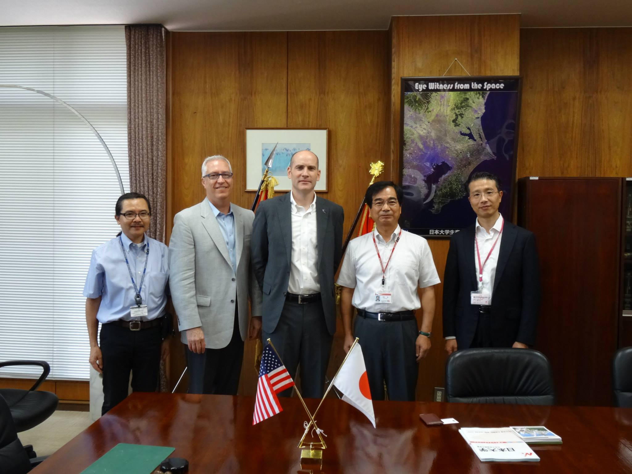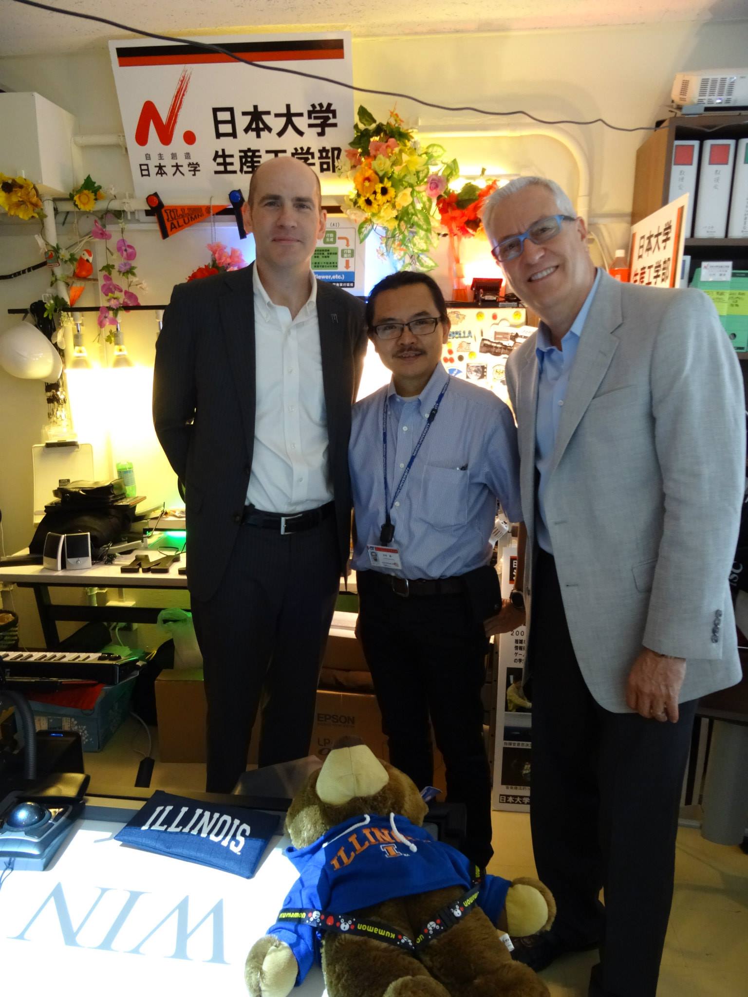 本日(2014年6月17日)生産工学部及び数理情報工学科では米国イリノイ大学(University of Illinois at Urbana-Champaign)の芸術学部長他ゲストをお迎えし,落合学部長への表敬訪問の後,米国イリノイ大学を卒業された数理情報工学科の古市研究室を訪問されました.古市研究室では学生が開発した交通シミュレータやLineHo!ckey等をはじめとするシリアスゲームを見学された他,未来工房等の施設を見学されました.今後このような研究者間の交流が期待されます.